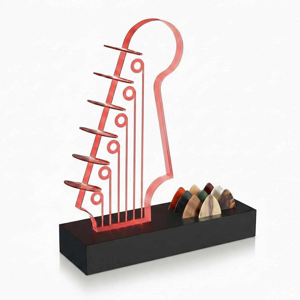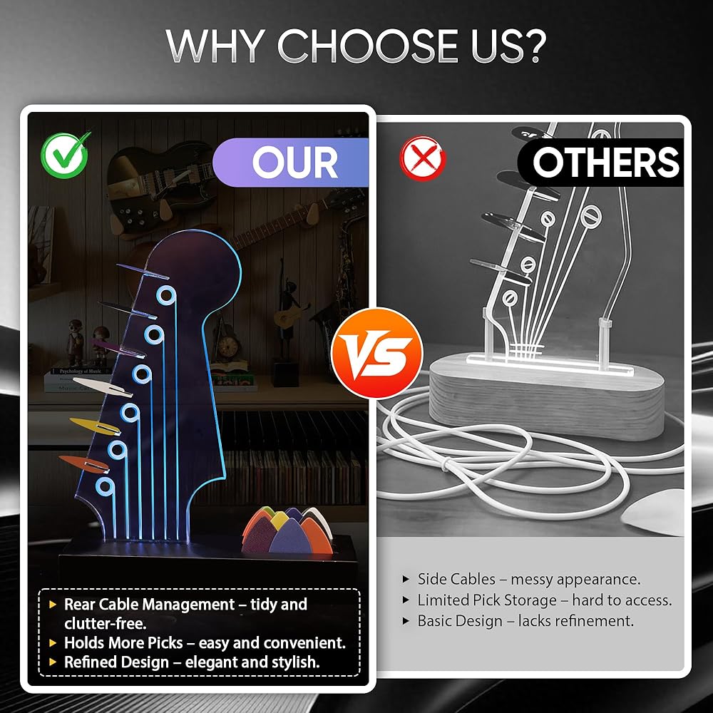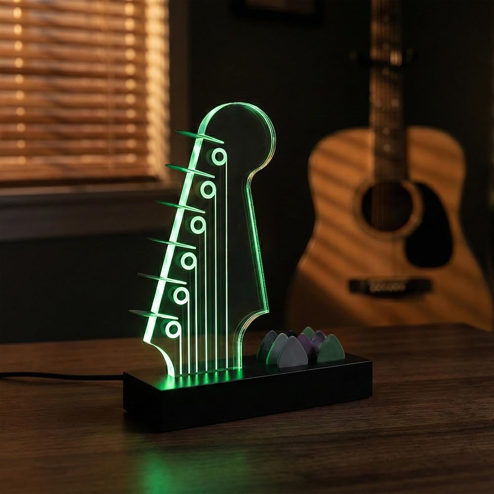 حامل اختيار الجيتار المضيء - تصميم رأس الجيتار الكهربائي، أضواء متغيرة 7 ألوان، هدايا الجيتار لمحبي الموسيقى، عرض اختيار الجيتار مع قاعدة خشبية، ملحقات جيتار رائعة وفريدة من نوعها