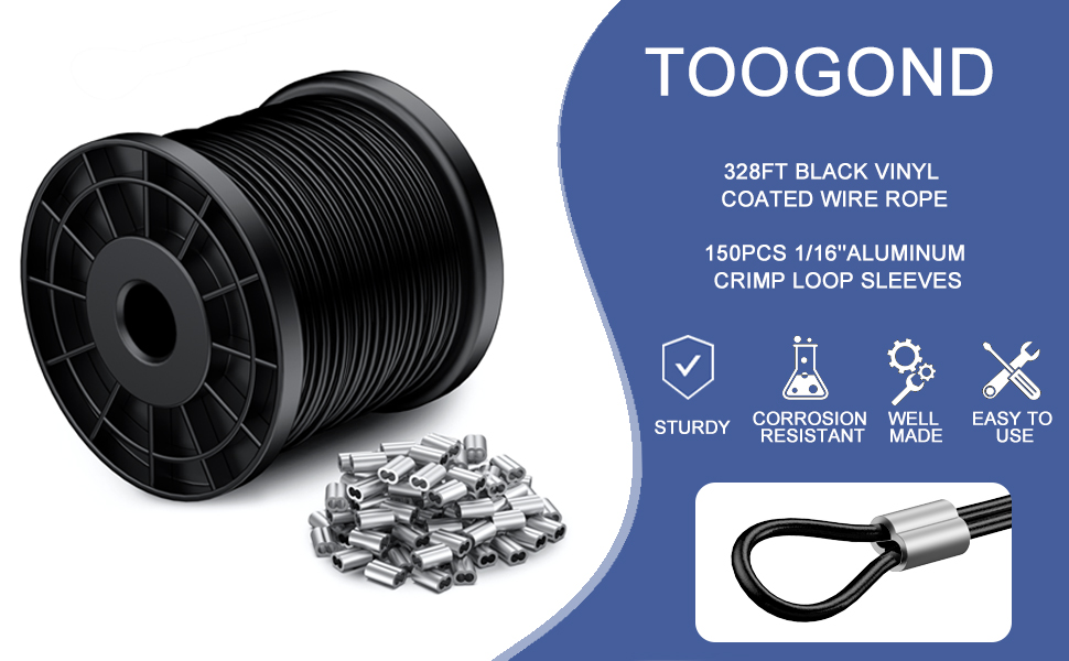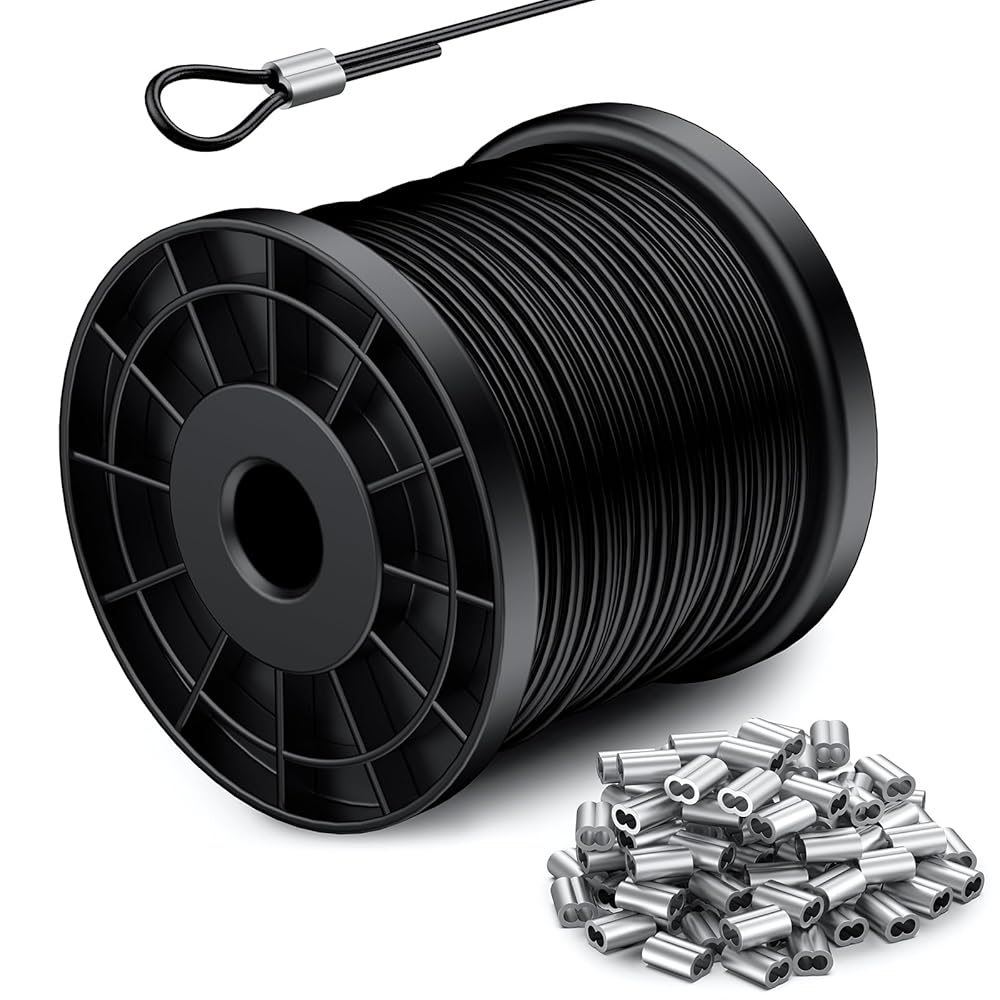 تركيب سهل بحلقات من الألومنيوم: يأتي هذا السلك الأسود مزودًا بـ 150 حلقة من الألومنيوم تسهل التثبيت والتركيب الآمن. يرجى ملاحظة أن هناك حاجة إلى أداة تجعيد إضافية لضغط الأكمام بشكل صحيح، مما يضمن لمسة نهائية ثابتة واحترافية لمشروعاتك.