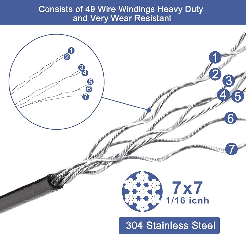 تصميم مرن وسلس: يتميز الحبل السلكي المطلي بالفينيل الأسود ببنية 7 × 7، مما يوفر مرونة استثنائية وسهولة التعامل من أجل تركيب سهل. طلاء الفينيل الأسود الأنيق لا يعزز الشكل الجمالي فحسب، بل يحمي يديك أيضًا أثناء الإعداد، مما يجعله الخيار الأمثل للتطبيقات المعقدة.