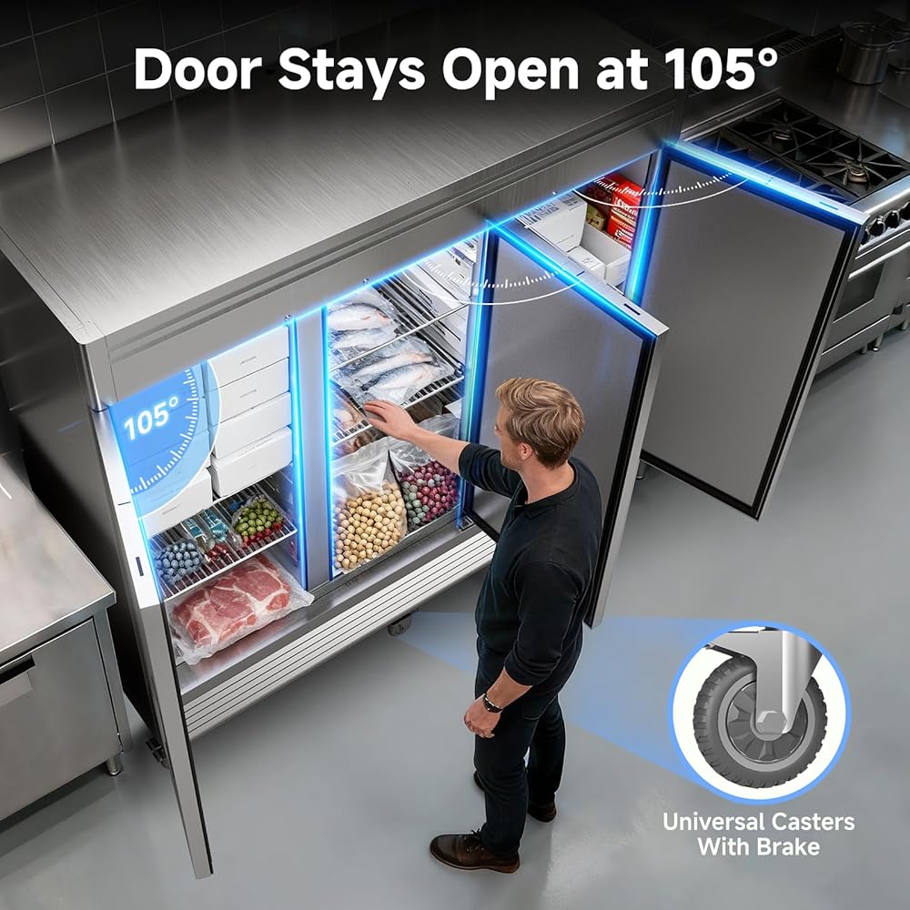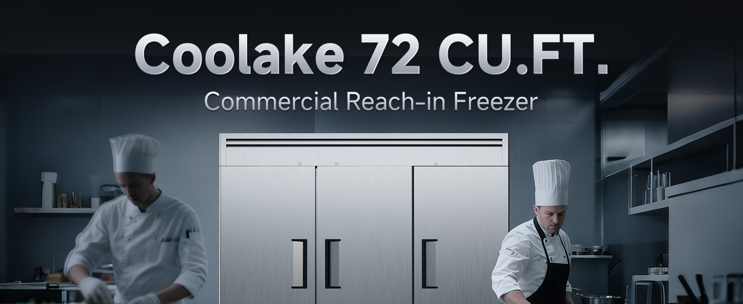 Coolake 82 "عرض الفريزر التجاري 3 أبواب صلبة، 72 قدم مكعب من الفولاذ المقاوم للصدأ يمكن الوصول إلى الفريزر العمودي مع إضاءة LED، مروحة تبريد الفريزر لمطعم بار متجر فندق منطقة إعداد المطبخ