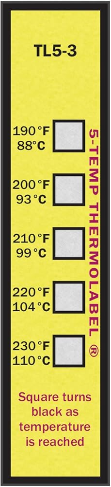 Paper Thermometer's 5-Temp Thermolabel features five incremental temperature sensitive elements that produce a non-reversible white to black color change at their rated temperatures. This provides a clear indication of which temperature has been reached. The self-adhering indicators are available in packages of 16 labels each. Labels have some resistance to liquids. Store in a cool, dry place.