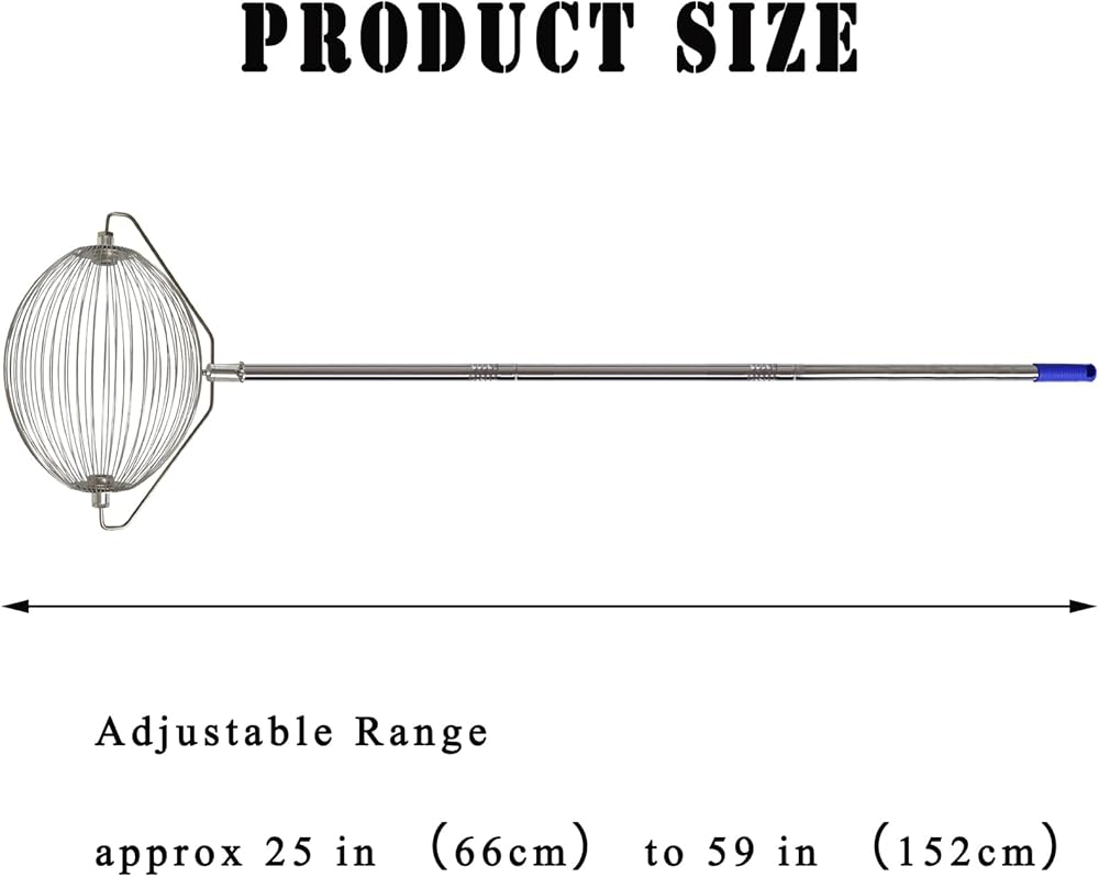 The ball picker is approximately 16 inches (42cm) in length and about 25 inches (66cm) to 59 inches (150cm) in height