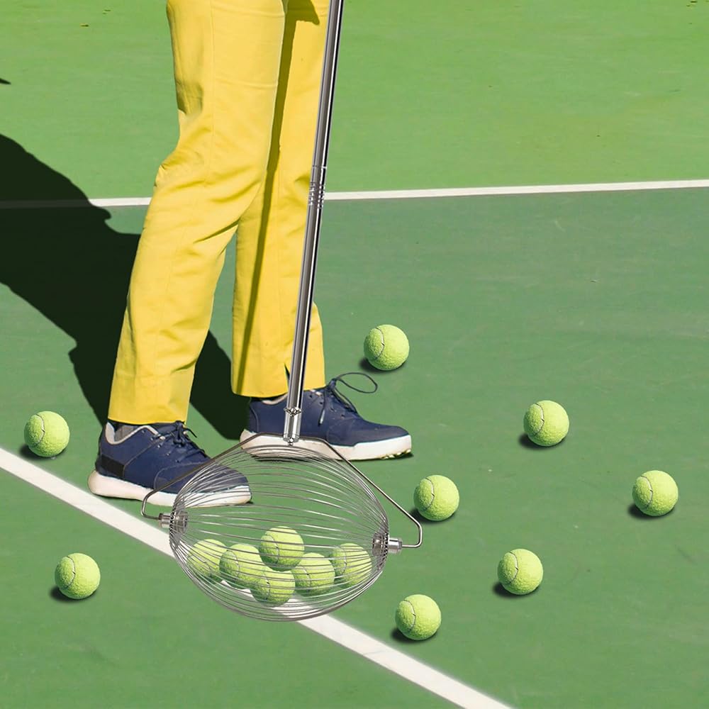 This tennis ball collector has a very wide range of applications and venues. It is suitable for picking up tennis balls or other spheres with diameters ranging from approximately 1.5 in (4cm) to 3 in (8cm). It can be used on various courts, hard courts, mountains, grass, etc.