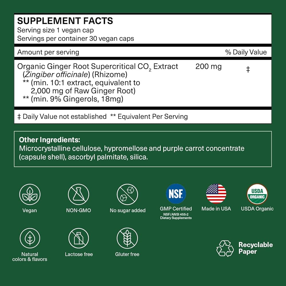 مستخلص الزنجبيل العضوي: يتميز بمستخلص جذر الزنجبيل العضوي عالي الفعالية، 200 مجم بنسبة 10: 1، تم إنتاجه باستخدام مستخلص ثاني أكسيد الكربون فوق الحرج الخالي من المذيبات من أجل النقاء والقوة.*