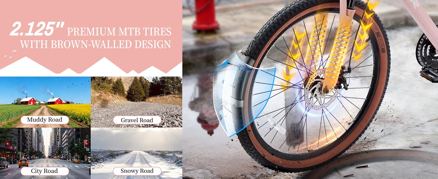 • ALL-TERRAIN TIRES WITH VINTAGE STYLE: Premium 2.125" brown-walled mountain bike tires feature anti-slip butyl rubber, conquering mud, gravel, snow, and city roads. Thickened wheel hubs enhance impact resistance for long-lasting trail performance.