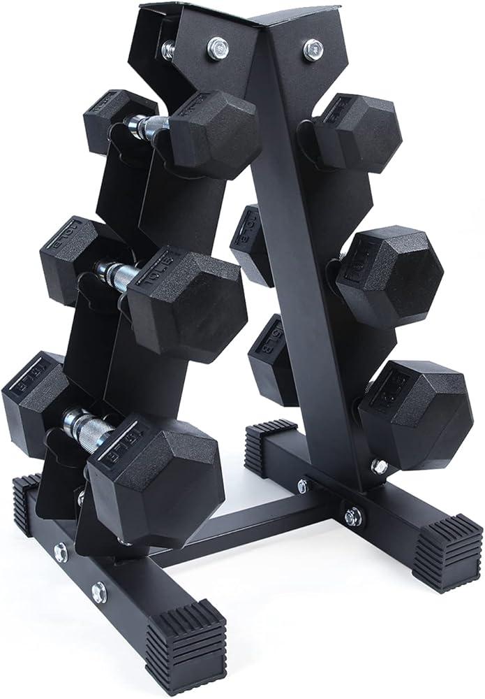 Maximize your space and performance with the RitFit Dumbbell Set. The A-frame rack stores rubber-coated hex dumbbells vertically to save floor space, with rubber liners for scratch-free protection.
