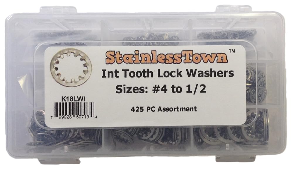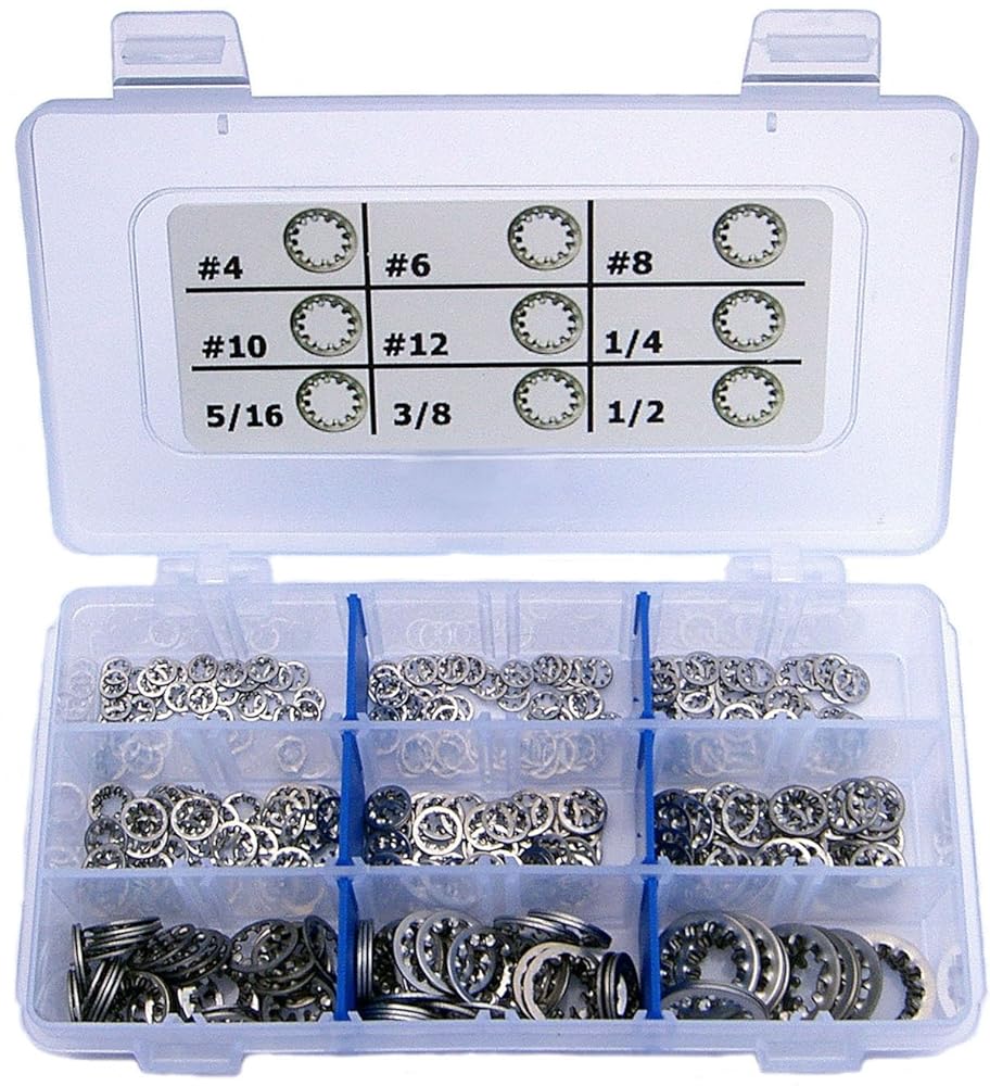 This is a quality stainless internal star lock washer assortment kit that includes to most popular sizes. This kit contains: 50pcs #4, 50pcs #6, 50pcs #8, 50pcs #10, 50pcs #12, 50pcs 1/4", 50pcs 5/16", 50pcs 3/8", 25pcs 1/2", 1pc Tuff Storage Container