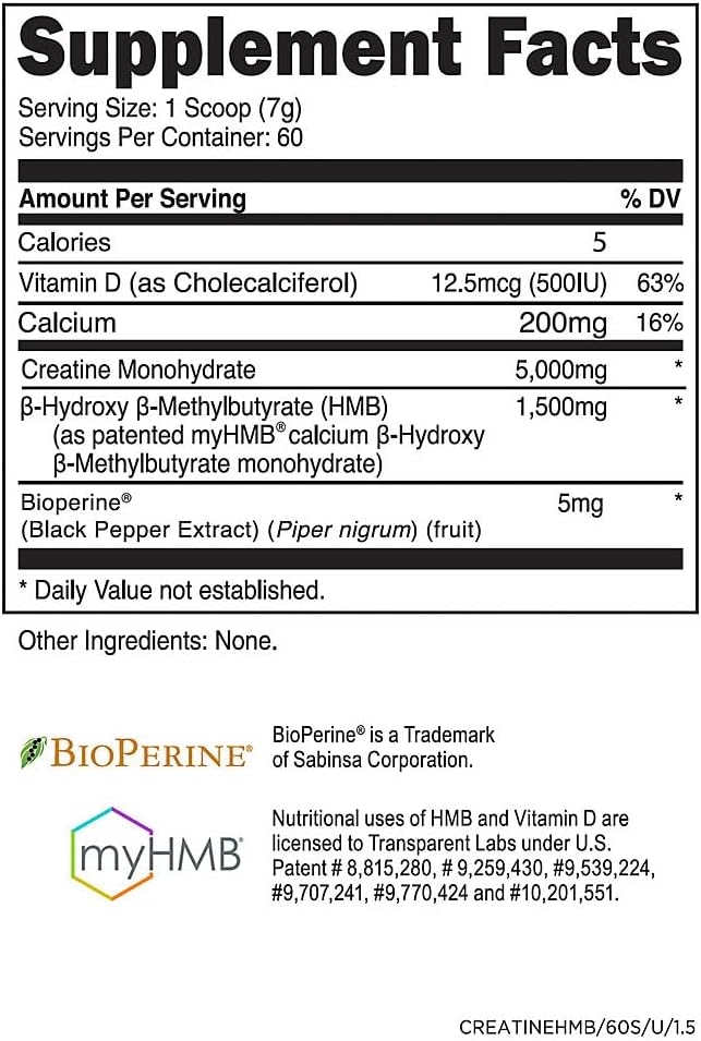 ['30 Servings Per Container : Each tub of Creatine HMB contains one month's worth of clinically dosed creatine monohydrate, HMB (as MyHMB), vitamin D3, and BioPerine to promote athletic performance and increase lean muscle mass.', 'Zero Artificial Additives : Our formula is free from artificial sweeteners, colored dyes, unnecessary fillers, and harmful additives. Instead, we use natural flavors and stevia to satisfy your taste buds without compromising your health.', 'Evidence-Based Synergy : Recent studies (cited below) have shown that creatine monohydrate and HMB significantly improve lean body mass and muscle strength gains beyond creatine or HMB supplementation alone.', 'Versatile Creatine Supplement : Being beneficial for both anaerobic and aerobic performance, Transparent Labs Creatine HMB is suitable for active individuals, gym-goers, and athletes with all types of training goals.', 'Flavors for Everyone : Choose from 12 deliciously refreshing fruit flavors, catering to every palate.', 'Vegan-Friendly Formula : Creatine HMB is crafted with vegan-friendly ingredients to help you perform better, recover quicker, and build/maintain lean muscle mass.', 'Third-Party Tested and Certified for Quality: As part of our commitment to industry-leading transparency and quality, every batch of this product is tested by a third-party lab for purity and potency. You can find all of our test results in the footer of our website. This product is also certified by Informed Choice to meet the highest standards for athletes and consumers.']