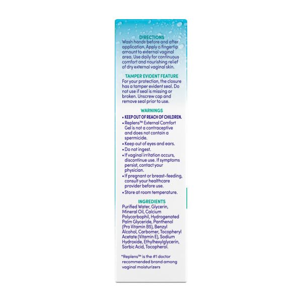External vaginal dryness can be a problem for some women of menopausal age due to the depletion of your body's natural moisture. It can also be an issue for women of any age due to other factors such as sex and exercise. Replens Moisture Restore External Comfort Gel helps soothe and relieve external vaginal dryness. This moisturizing formula with the Hydrapro Complex(TM) includes Vitamin E and Pro-Vitamin B5, and helps relieve irritation, discomfort & chafing from external dryness, so you feel like yourself again.
