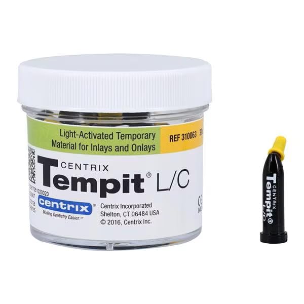 Tempit L/C - Light-Activated Temporary Material for Inlays and Onlays, 30 - .25 Gm. Prefilled Tips. Perfect for indirect restorations, inlays/onlays. Sets firm yet flexible. No etching or bonding agent required. Indicated for inlays, onlays, and indirect restorations. Requires no burs or bonding agent. Sets firmly but remains flexible. Can be removed with an explorer. Tempit LC is a light-activated, non-permanent material ideal for indirect restorations, inlays, and onlays and for sealing of openings of implant screws access. This unique filling restorative no longer requires any etching or bonding agent, remaining flexible once it sets after 40 seconds.It promotes easy removal by using an explorer, preventing any damage on the margins. Tempit LC comes in a 0.25 g prefilled tube.