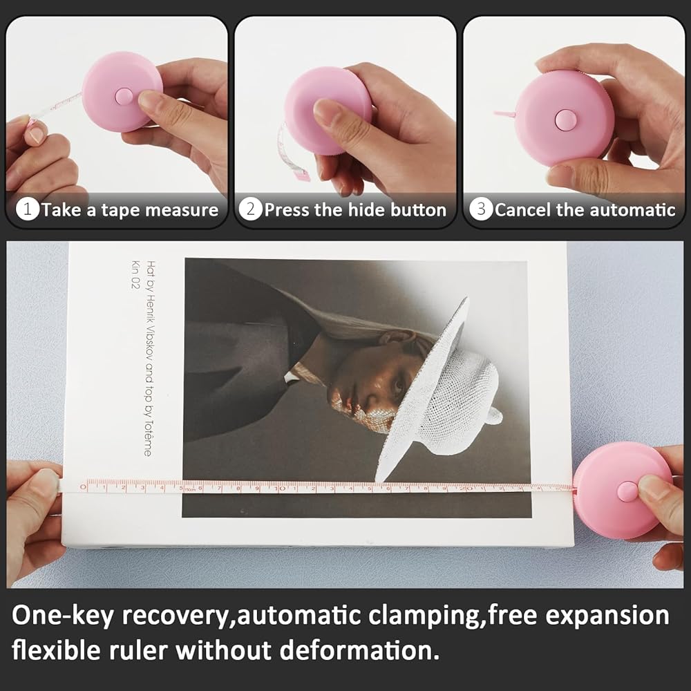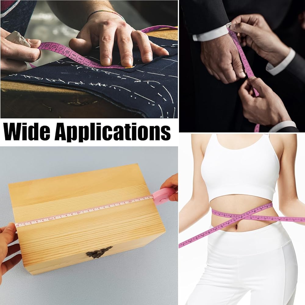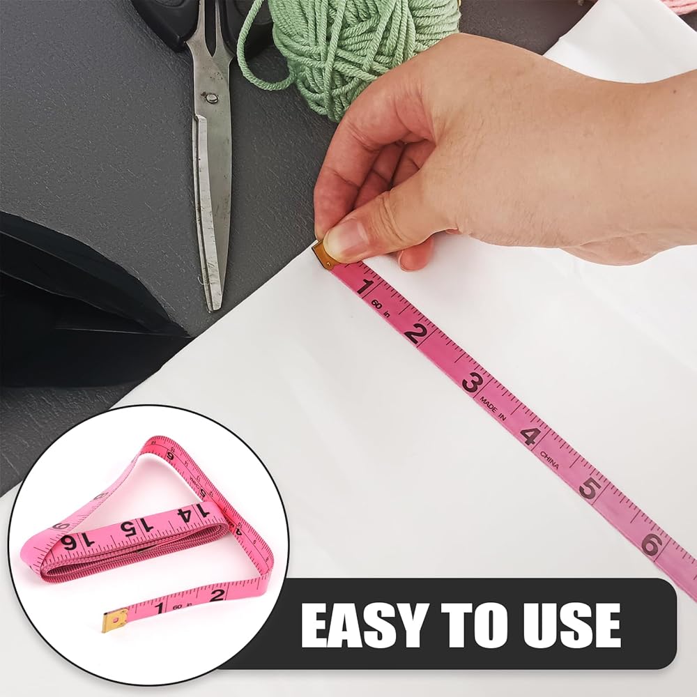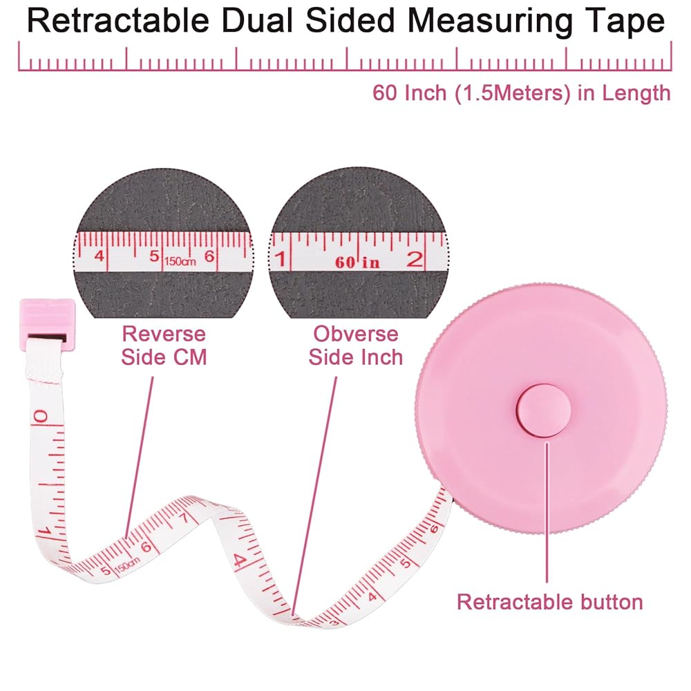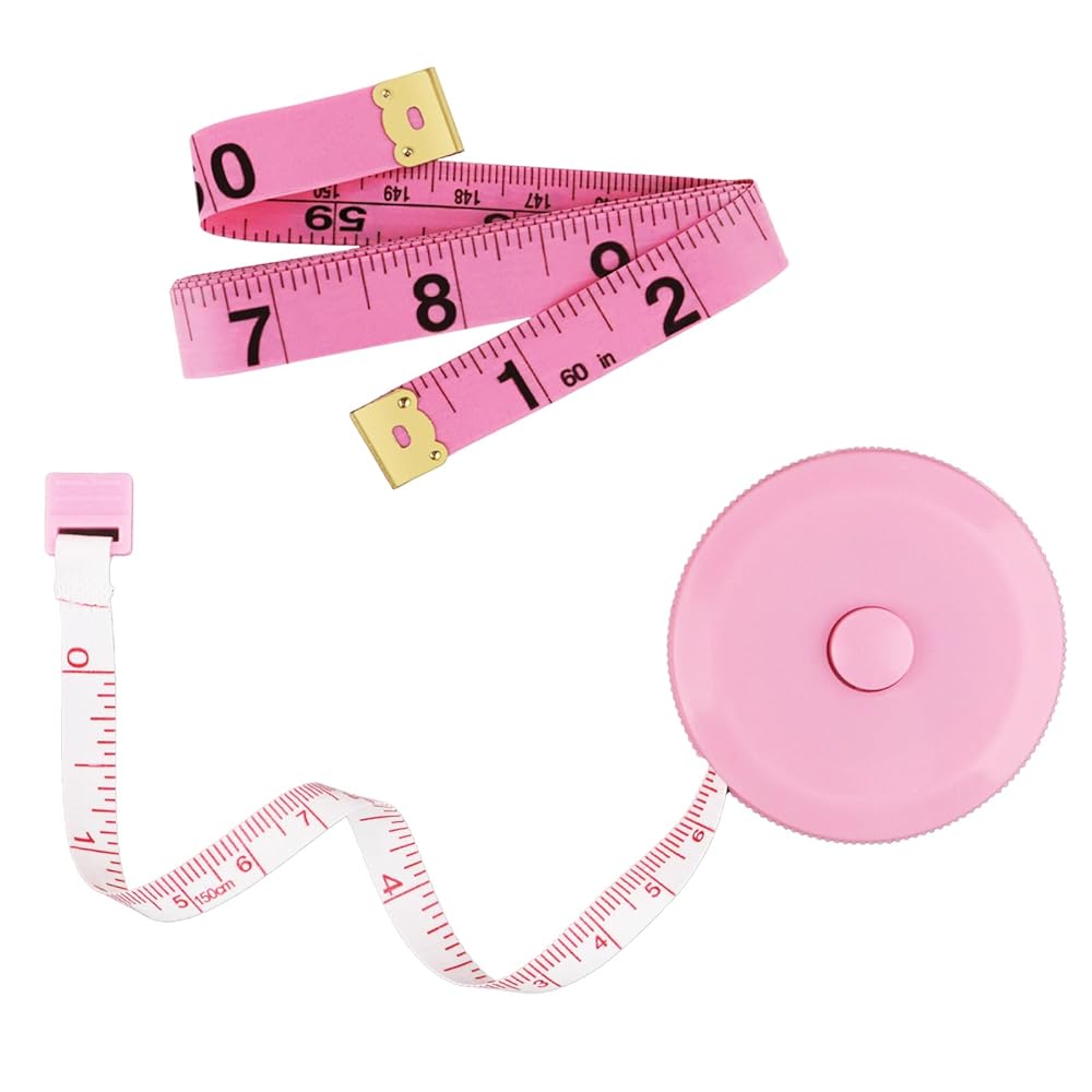 Discover precision measuring made simple with this versatile 2-pack of GDMINLO measuring tapes. Each tape measure extends to a generous 60 inches, making them perfect for body measurements, sewing projects, tailoring work, and various crafting needs. The set features attractive pink/white dual-sided color combinations, ensuring clear visibility and easy reading in any lighting condition. The smooth retractable mechanism allows for convenient storage and portability, while the durable plastic construction ensures lasting performance. These flexible tapes conform perfectly to curved surfaces for accurate body measurements, making them ideal for tracking fitness progress or taking garment measurements. With 0.1-inch measurement accuracy, you can count on precise results for all your measuring needs. Keep these handy tools in your sewing kit, craft room, or tailoring workspace for quick access whenever measurement tasks arise. The practical button lock feature helps maintain your measurements exactly where you need them.