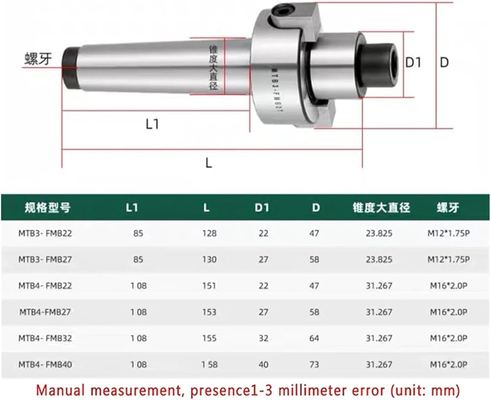 • The Face Endmill Adapter MT2 MT3 MT4 is designed for seamless compatibility with a variety of CNC machine tools, ensuring you can use it with FMB22, R8, FMB27, FMB32, FMB40, NT30, NT40, and C20 tool holders.