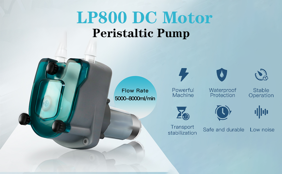 معدل تدفق عالي للغاية وسوائل لزجة متوافقة: يوفر تدفقًا بحد أقصى 8000 مل/دقيقة، مناسب تمامًا لجرعات ونقل وتعميم السوائل عالية اللزوجة؛ متوافق مع أنابيب السيليكون 73# (9.6×16 مم ID×OD) و82# (12.7×19.1 مم ID×OD) للاستخدام متعدد الاستخدامات