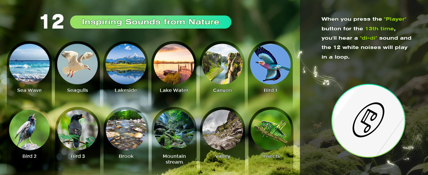 12 خيارًا للصوت الطبيعي المريح - انغمس في مجموعة متنوعة من أصوات الطبيعة عالية الجودة بما في ذلك طيور الغابة وأمواج المحيط وتيارات الثرثرة والمزيد. - كل حلقة مصممة للاسترخاء أو التركيز أو مساعدتك على النوم بشكل أفضل. ***عندما تضغط على "زر المشغل" للمرة الثالثة عشرة، ستسمع صوت "di-di-di"، وسيتم تشغيل الأصوات البيضاء الـ 12 في حلقة.