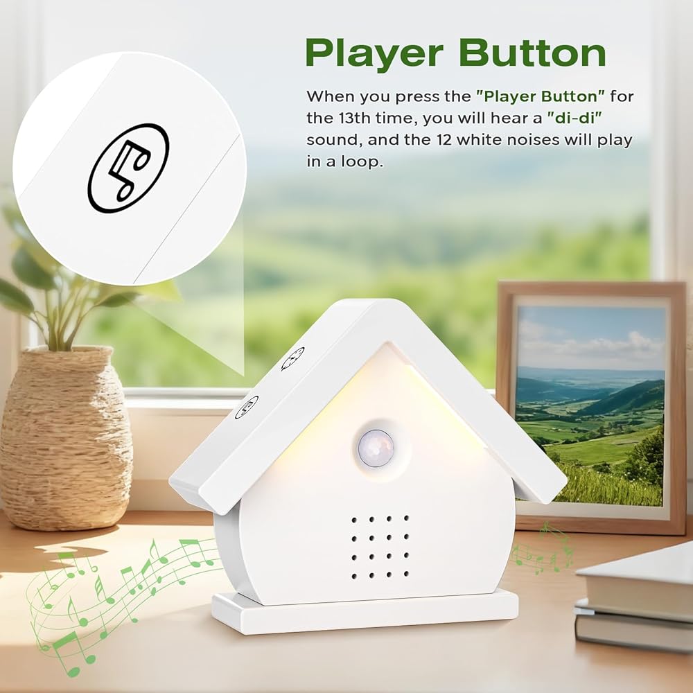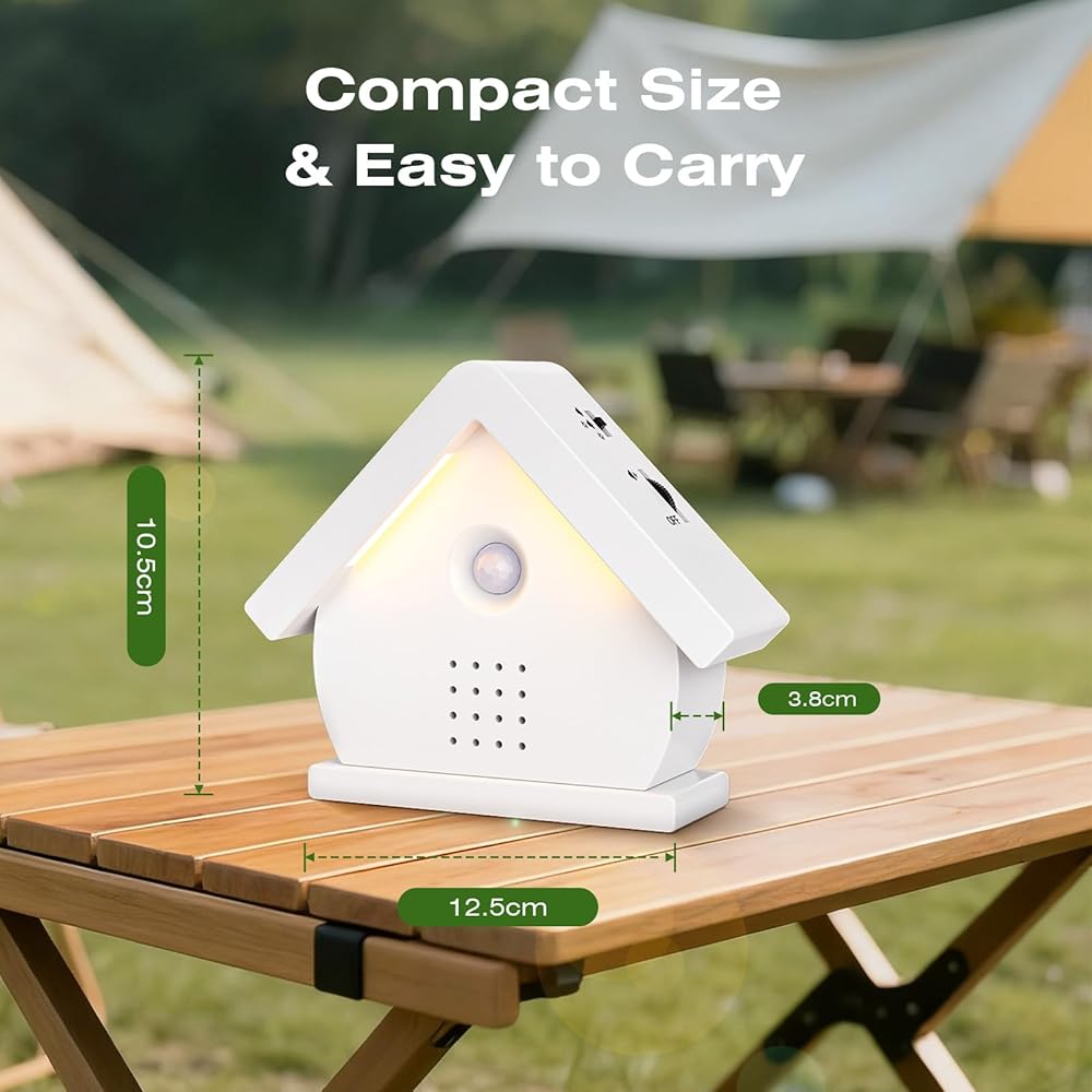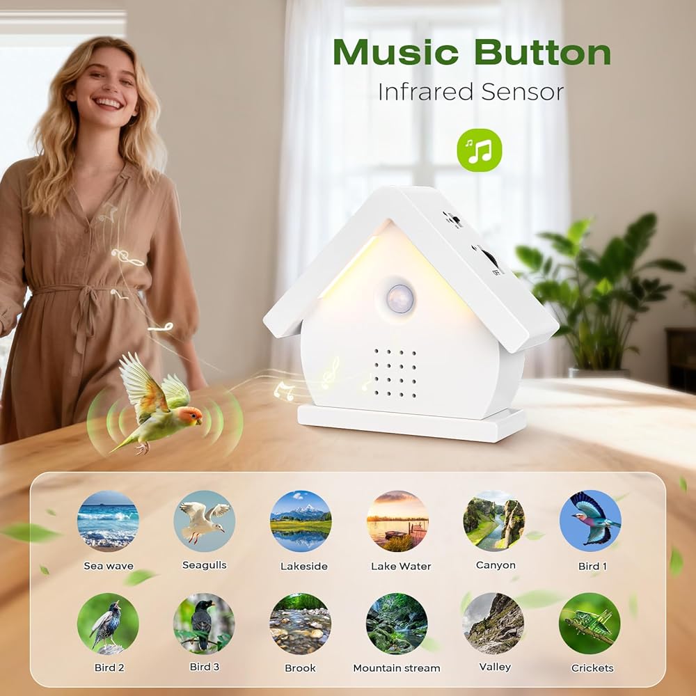 صندوق غناء الطيور الأصلي، صندوق صوت طبيعي مع مستشعر حركة، مصابيح LED، مؤقت، 12 أغنية مهدئة، صندوق زقزقة الطيور المحمول، علاج صوتي بالضوضاء البيضاء للحمام، المنزل، استرخاء البالغين (0-90 ديسيبل)