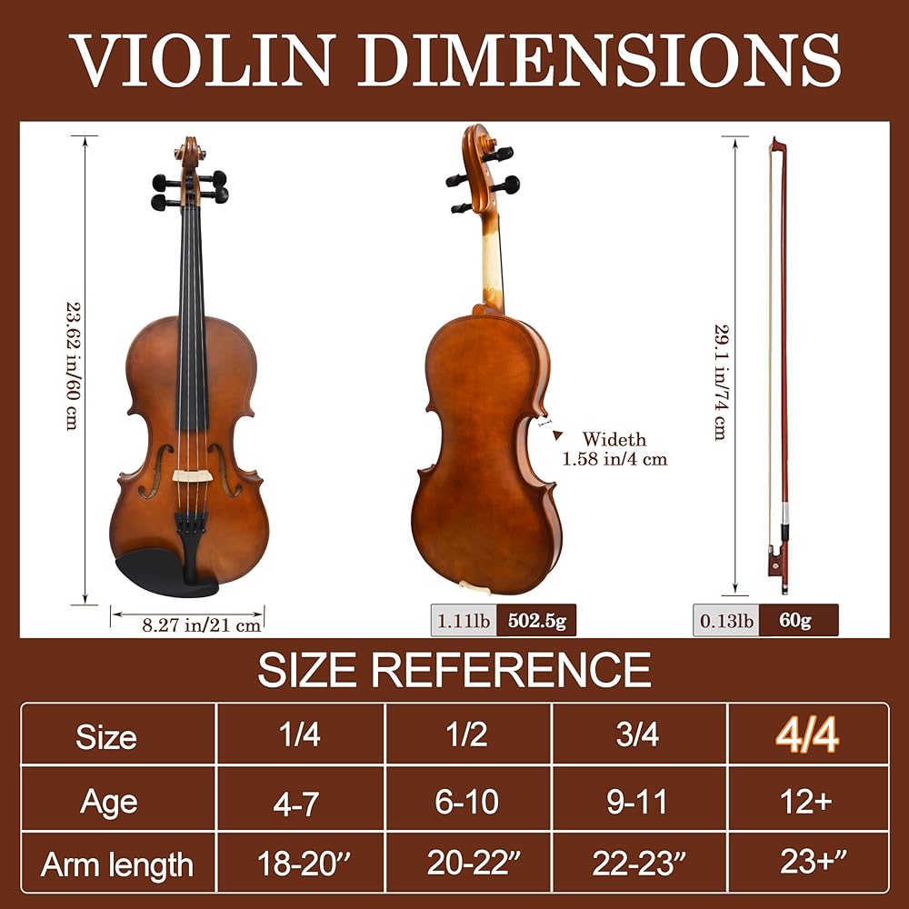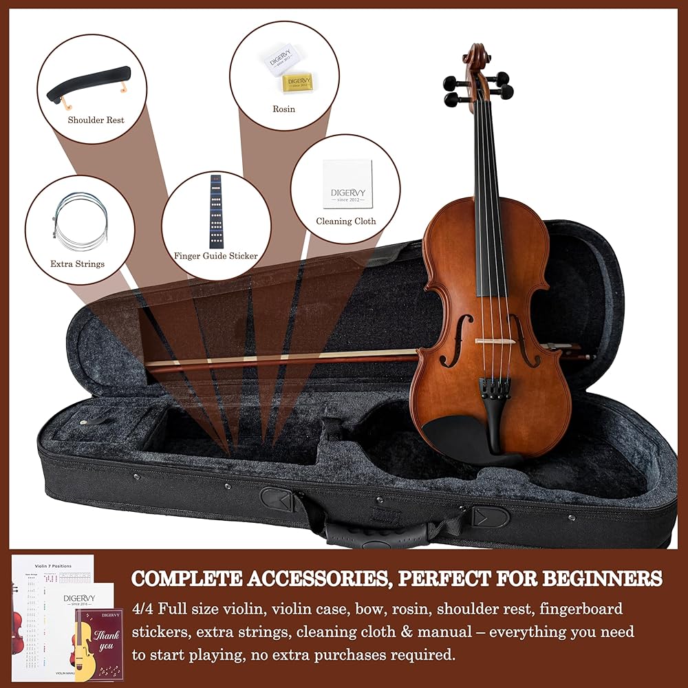 🎻 مجموعة الكمان الكاملة للمبتدئين: تشتمل مجموعة الكمان الكل في واحد هذه على حقيبة مبطنة وفيونكة وروزين ومسند للكتف وملصقات للوحة الأصابع وأوتار إضافية وقطعة قماش للتنظيف ودليل التعليمات. نحن نقدم كل ما تحتاجه لبدء اللعب على الفور دون الحاجة إلى عمليات شراء إضافية. يتم اختيار كل ملحق بعناية لدعم ممارستك الأولية وضمان تجربة موسيقية خالية من المتاعب من اليوم الأول.