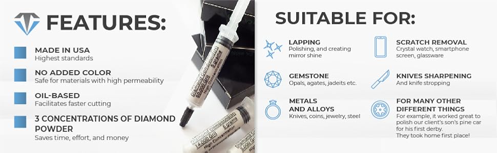 سهولة الاستخدام للتلميع اليدوي والآلة - مع قوام زيتي من الدرجة الصناعية، فإن معجون الماس الخاص بنا سهل الاستخدام على عجلة التلميع، أو شريط جلدي، أو قطعة قماش ناعمة. تضمن تركيبته المصممة علميًا تطبيقًا سلسًا ومحكمًا وجلسات تلميع تدوم طويلاً