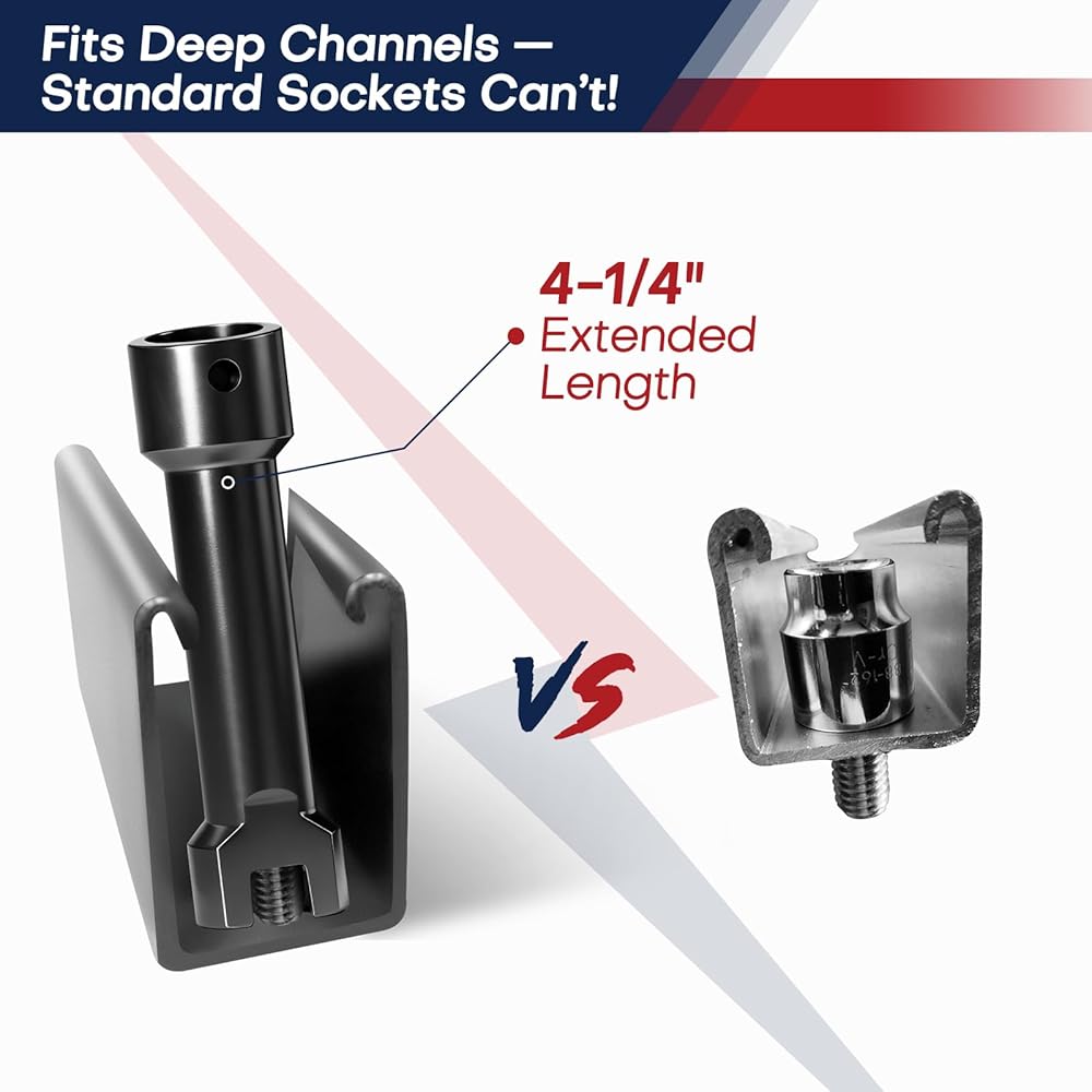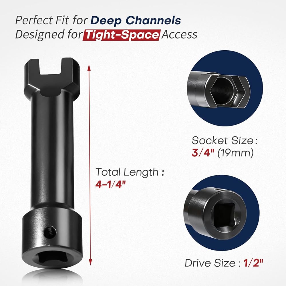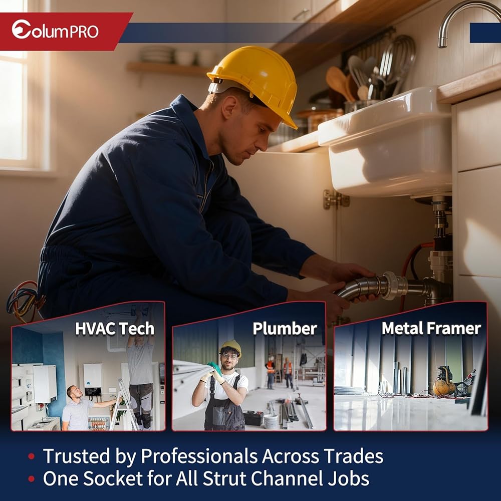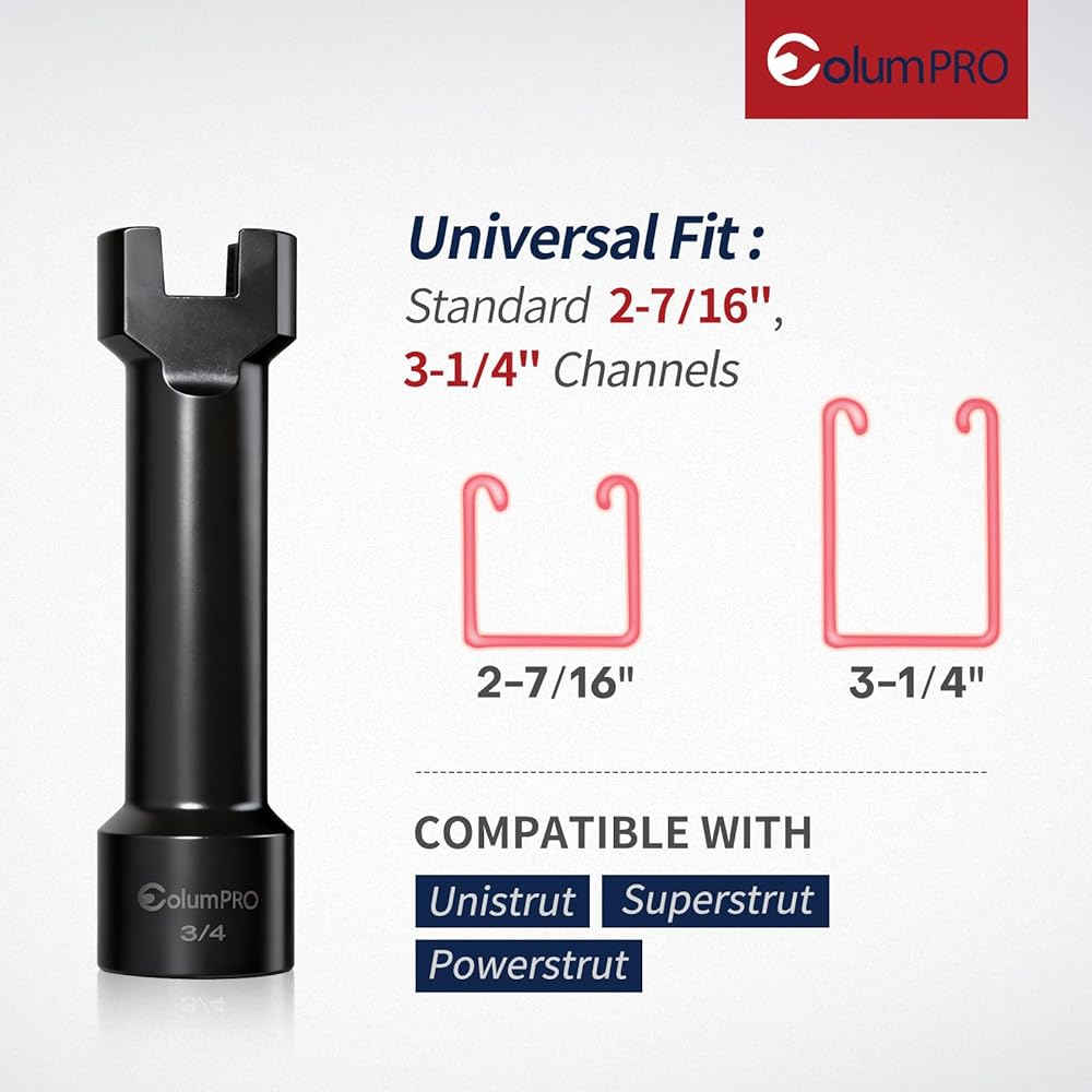 The ColumPRO 3/4" (19mm) Strut Channel Socket is built for professionals who demand power, precision, and durability. Designed to fit 1-5/8", 2-7/16", and 3-1/4" Unistrut and metal framing channels, it's the go-to solution for electricians, HVAC technicians, plumbers, and contractors working with heavy-duty strut systems. Constructed from premium Cr-Mo (Chrome Molybdenum) steel, this socket offers superior impact strength and torque resistance compared to standard Cr-V steel. The black phosphate finish enhances corrosion resistance and maintains smooth operation even after extended use. With a 4-1/4" overall length, it provides the extra reach needed for deep channels while ensuring precise fitment and easy access. Compatible with 1/2" drive impact wrenches and ratchets, it delivers consistent, professional-grade performance in every fastening task. Whether you're assembling conduit systems, mounting support frames, or tightening Unistrut connections, the ColumPRO Cr-Mo Impact Socket is a reliable, long-lasting addition to your tool kit—engineered to handle the toughest jobs with confidence.
