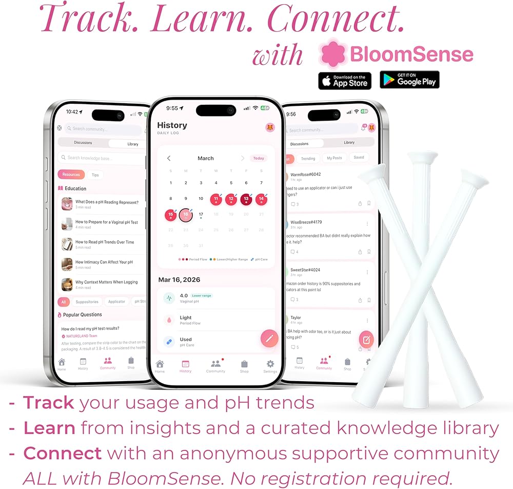 🌸 تواصل مع مجتمع BLOOMSENSE - يتضمن تطبيق BloomSense المجاني (App Store وGoogle Play) مجتمعًا خاصًا ومجهولًا حيث تشارك النساء النصائح حول إجراءات الصحة، ويطرحن الأسئلة، ويدعمن بعضهن البعض - بدون اسم أو حكم. تصفح مكتبة المعرفة للحصول على مقالات صحية موثوقة، وتتبع رحلة الرقم الهيدروجيني لديك جنبًا إلى جنب مع روتين الرعاية الخاص بك. ابحث عن "BloomSense pH Tracker" للتنزيل.