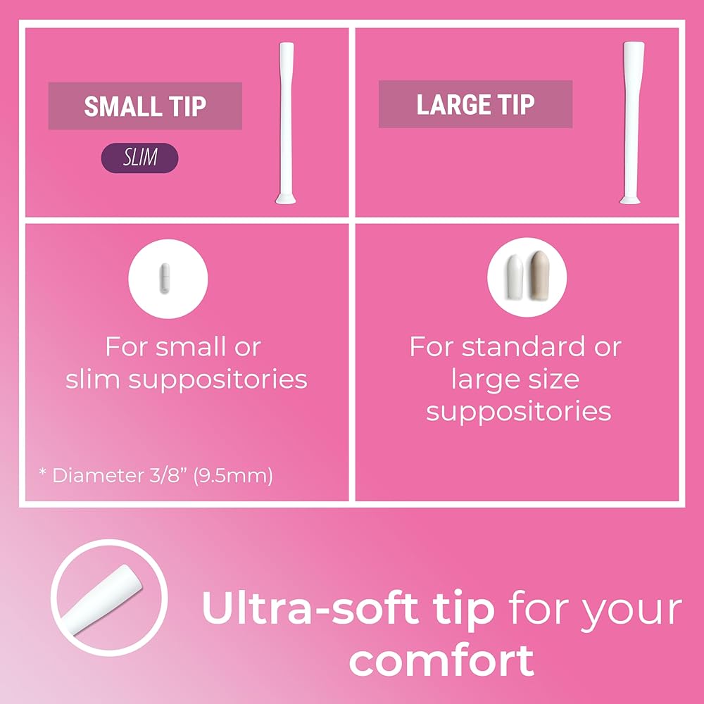 ☀ تطبيق مريح وسهل - أدوات توزيع المكياج ذات الأطراف المريحة الناعمة كالحرير تجعل إدخال التحميلة سهلاً ونظيفًا ومريحًا. متوفر بحجمين: طرف كبير للتحاميل القياسية على شكل رصاصة، وطرف رفيع للمنتجات الصغيرة على شكل كبسولة (قطر أقل من 3/8 بوصة). يرشد التصميم المريح الوضع الدقيق في كل مرة، حتى تشعر بالثقة في روتين العناية الحميمة الخاص بك.