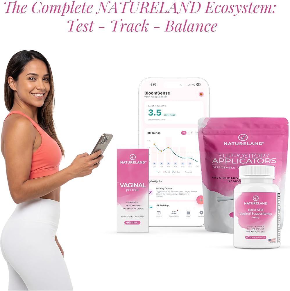 🌸 اختر المقاس المناسب وأكمل روتينك - نصيحة كبيرة: تناسب التحاميل القياسية على شكل رصاصة بما في ذلك تحاميل حمض البوريك NATURELAND (تحتوي أيضًا على كبسولات أصغر، ولكن بمقاس أكثر مرونة). نصيحة رفيعة: مصممة للتحاميل الصغيرة على شكل كبسولة بقطر أقل من 3/8 بوصة (9.5 ملم) من أجل تثبيت مريح وآمن. كلاهما متوافق مع معظم التحاميل الموجودة في السوق. أكمل روتين العافية الخاص بك مع شرائط اختبار درجة الحموضة من NATURELAND وتطبيق BloomSense - اختبر، وتتبع، وتوازن، وازدهر.