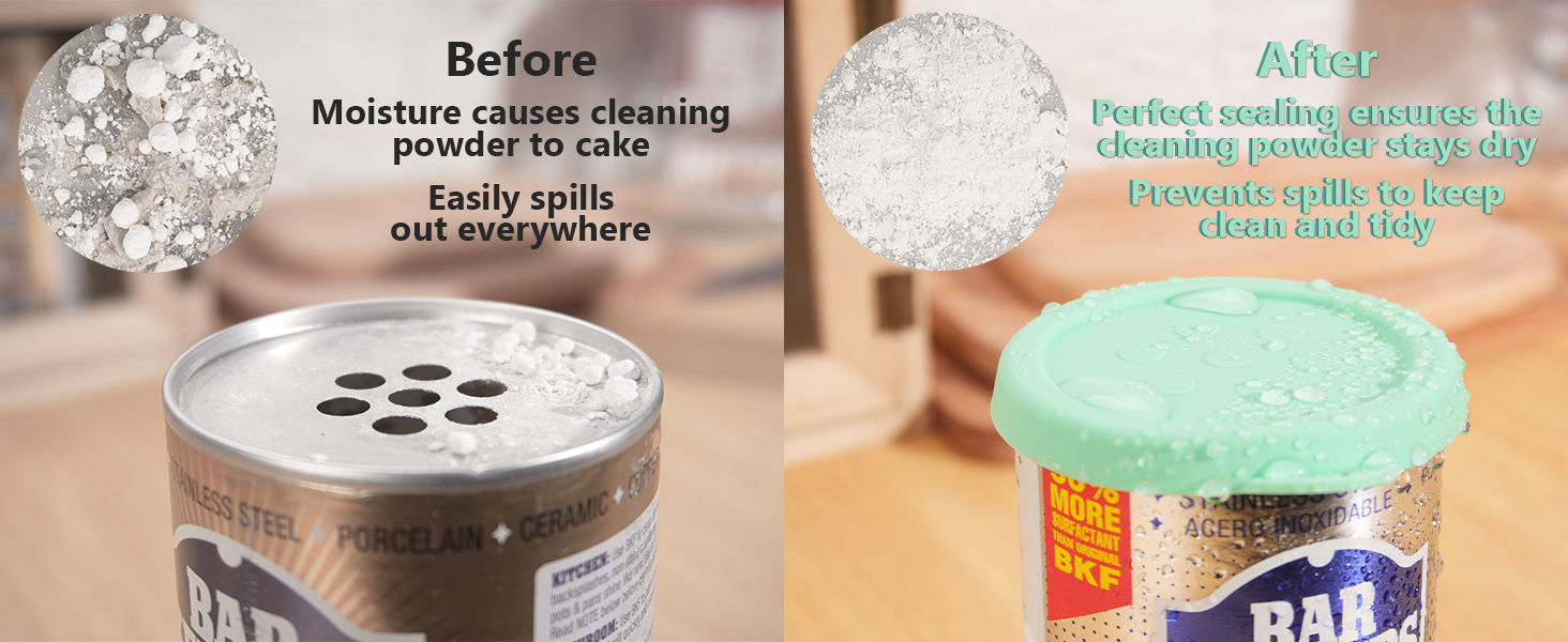 إغلاق مثالي: تخلق الأغطية إغلاقًا آمنًا على علبة المسحوق، مما يساعد على منع التعرض للرطوبة والحفاظ على مسحوق التنظيف جافًا. يساعد ذلك على تقليل الانسكاب والتكتل، مما يحافظ على نظافة المساحة ويجعل استخدام المسحوق أسهل.