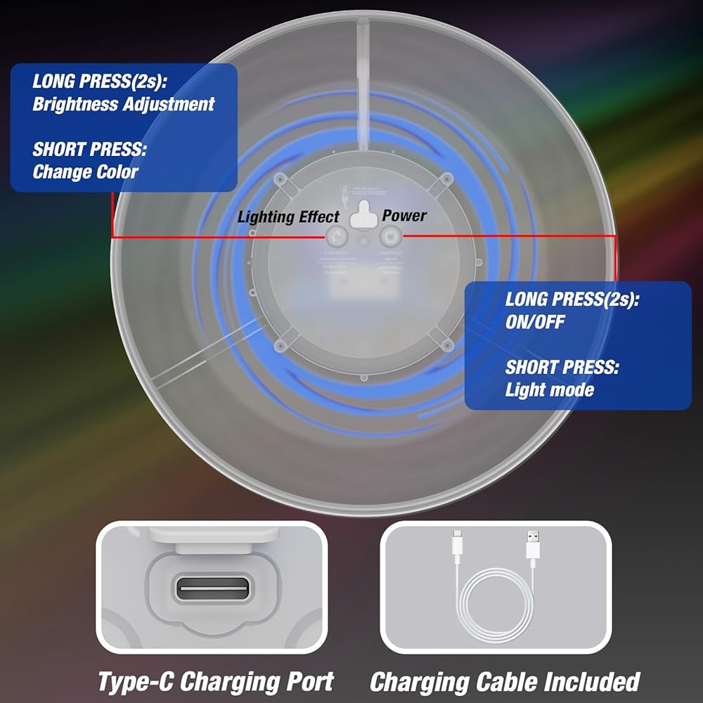 قابلة لإعادة الشحن و4 سطوع قابل للتعديل: اضغط مع الاستمرار على المفتاح لمدة ثانيتين لتجربة لعبة الأقراص الطائرة المضيئة في كل لحظة من اليوم. 4 سطوع قابل للتعديل يمكن تبديله بمرونة لإضافة المتعة إلى لعبة القرص. لن يخرج حتى لو توقفت عن الحركة. يمكن للأطفال الاستمتاع بعدة ساعات من اللعب المتواصل باستخدام البطارية القابلة لإعادة الشحن. تتضمن العبوة 1x كابل شحن من النوع C.