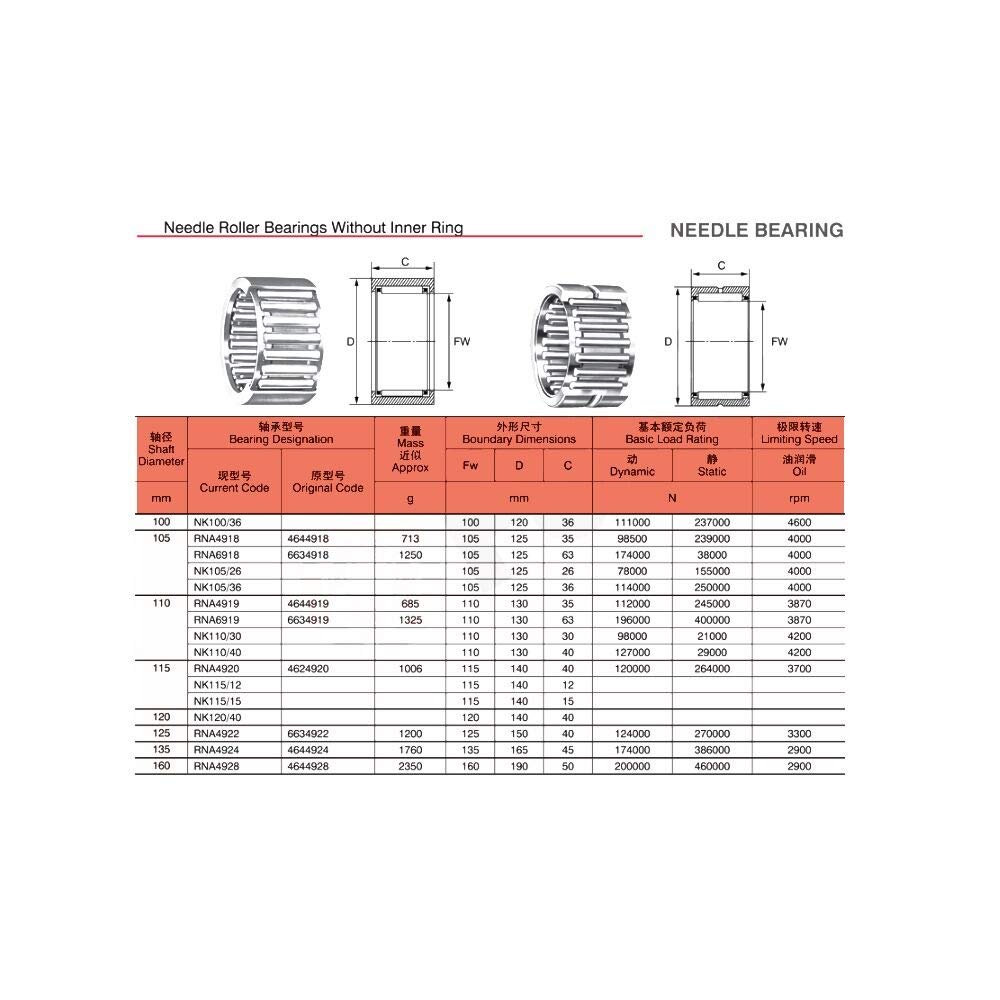 The needle roller bearing without inner ring is suitable for the parts of which the radial size is limited Because of no inner ring the surface of shaft journal fitted with it is acted directly as rolling surface It is requested that the surface hardness be no less than HRC60 surface roughness no more than 0.63μm. This kind of bearing does not limit th