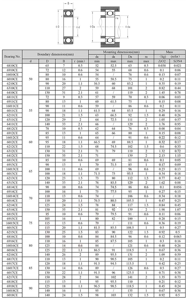 Full ceramic bearing made with Si3N4 have some better performance than ZrO2 the rings and balls made by full ceramic material:Si3N4 as a standard construction the cage made by PTFE Compares than the material of ZrO2 The SiN4 ceramics bearings could endure heavier load and could be used in higher temperature environment.