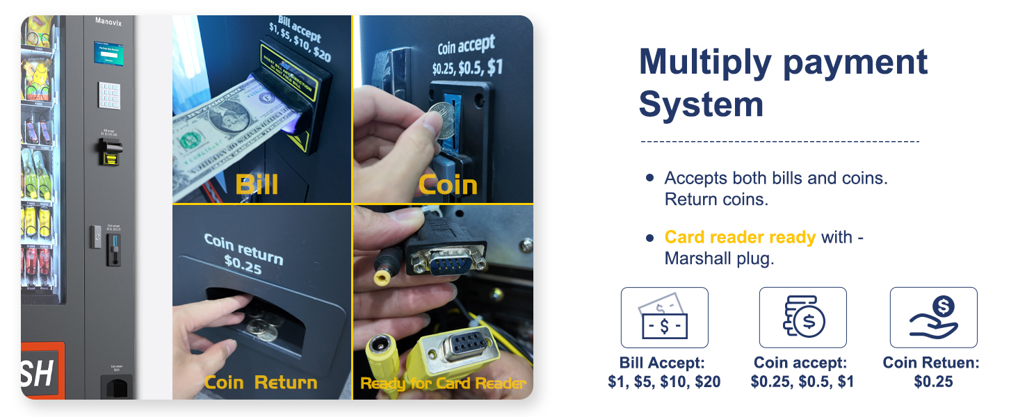 ⭐[متقبل فاتورة عالية الدقة والعملة]: تتميز آلة بيع Manovix بفاتورة عالية الدقة ومتقبل للعملات المعدنية، مما يضمن المعاملات السلسة ويزيل مشكلات الدفع. يقبل الفواتير (1 دولار، 5 دولارات، 10 دولارات، 20 دولارًا) والعملات المعدنية (0.25 دولار، 0.5 دولار، 1 دولار)، مع التغيير المعطى بزيادات قدرها 0.25 دولار. ويمنع النظام المتقدم أيضًا تزييف الأموال، مما يوفر تجربة موثوقة وخالية من المتاعب.