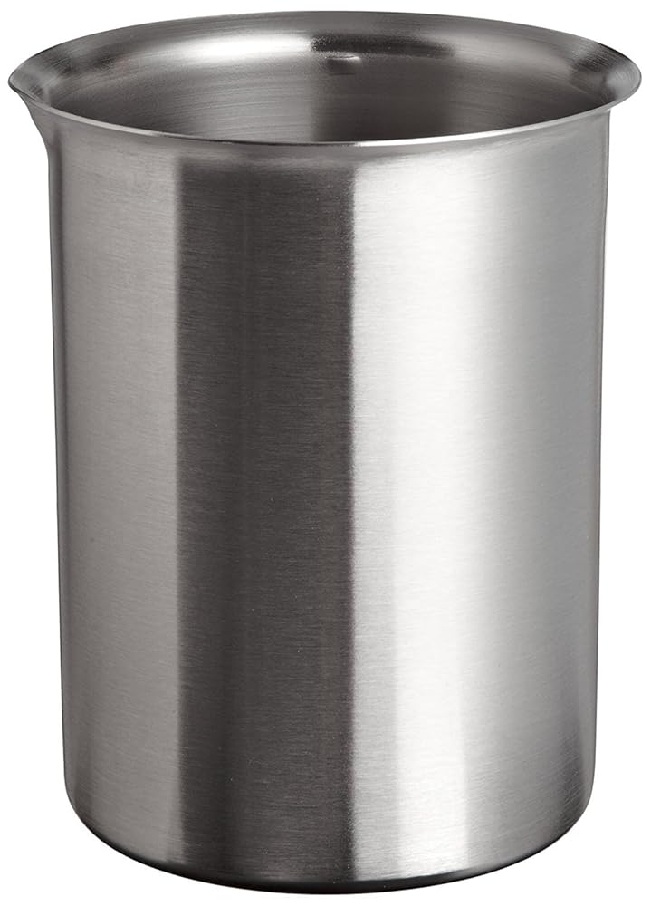 Seamless stainless steel construction with pour spout. Pour spout allows for easy transfer of liquids. Capacity full-mark near top of beaker assures accurate measuring. Measures 4-1/8" OD by 6-1/16" height. 1200mL Capacity.