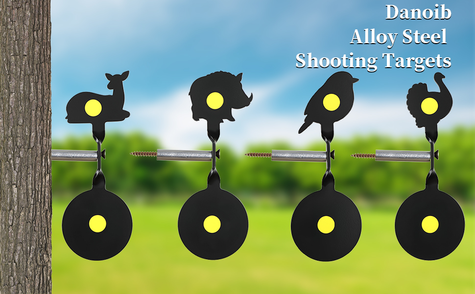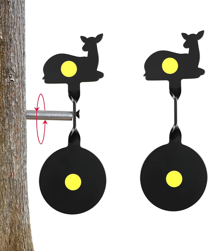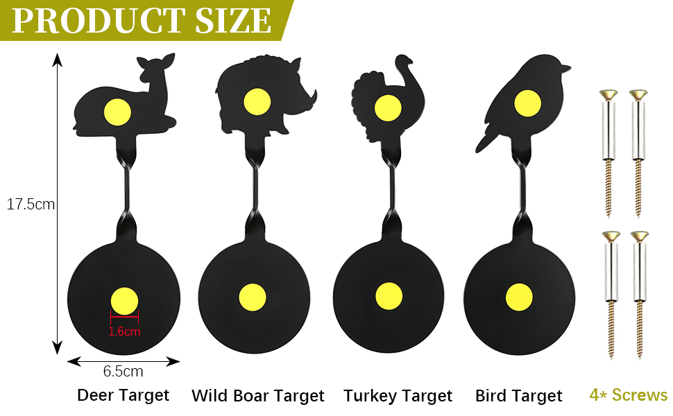 Enhance your shooting skills with our 4 Pcs Metall Spinning BB Gun Targets, designed for both practice and competition. Each set includes four animal silhouettes—deer, bird, turkey, and wild boar—crafted from 3mm thick high-strength steel with a rust-resistant coating for superior durability and outdoor use. The auto-reset and 360° spin mechanism ensures continuous shooting without manual intervention, making these targets perfect for improving accuracy, reaction speed, and moving target engagement. Whether you're training in your backyard, forest, or shooting range, these targets offer a reliable and engaging experience. Setup is quick and easy with included screws and metal cylinders, allowing you to mount targets on various surfaces in seconds. The high-contrast yellow bullseye and audible “ping” on impact provide clear feedback for each shot, enhancing training effectiveness. Ideal for air rifles, BB guns, slingshots, and pellet guns, these targets are safe for users of all skill levels. Their robust construction and thoughtful design make them a must-have for shooting enthusiasts, firearm safety courses, scout groups, and family shooting days.