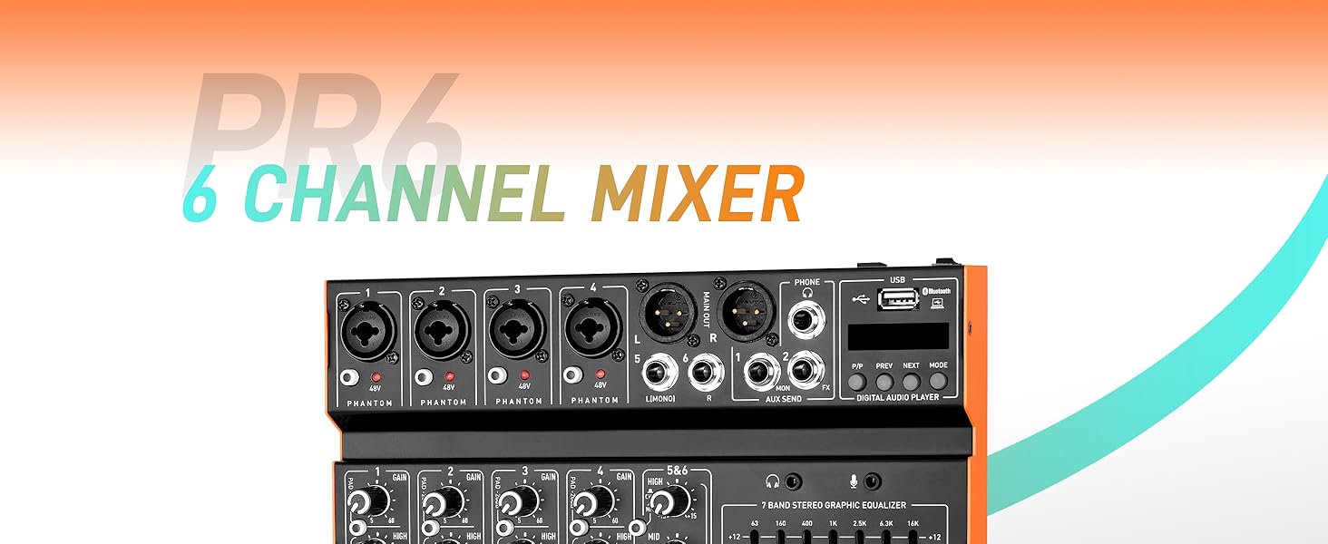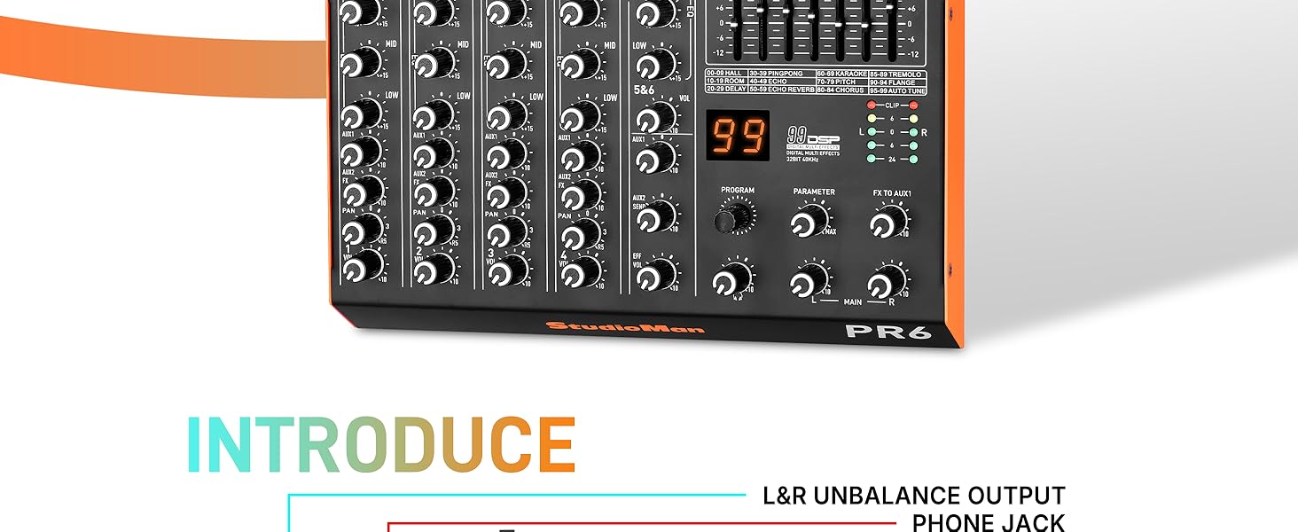 【خلاط صوت ذو 6 قنوات مع تحكم مستقل في PAN وضبط دقيق】 يتميز خلاط الصوت StudioMan PR6 ذو 6 قنوات بـ 4 مدخلات ميكروفون/خط أحادية XLR (مع التحكم في الكسب) + مدخل استريو واحد لتوصيلات صوتية مرنة. تحتوي كل قناة على معادل صوت مستقل ثلاثي النطاق، وإرسال AUX، ومستوى FX، وتعديل صورة صوت PAN، وتخفيف مستوى الصوت، مما يتيح ضبطًا دقيقًا للغناء والأدوات والموسيقى، مع إخراج استريو متوازن لنظام الصوت الخاص بك.