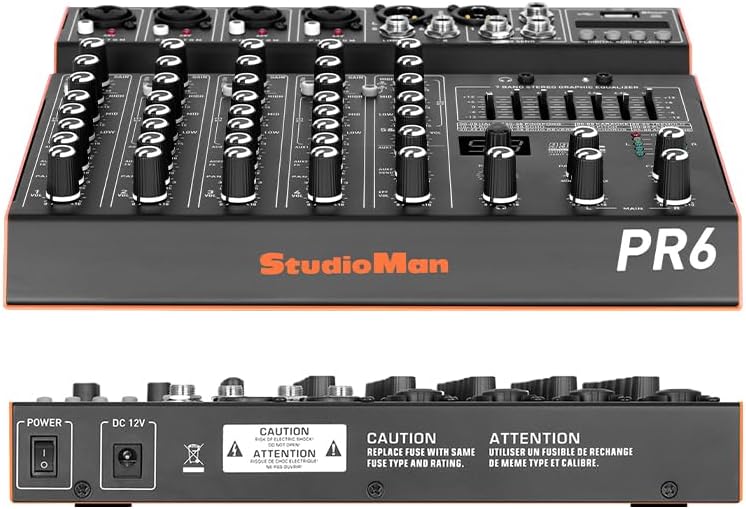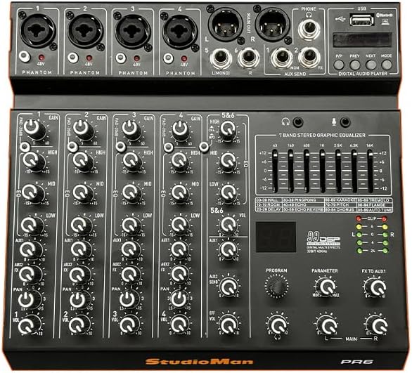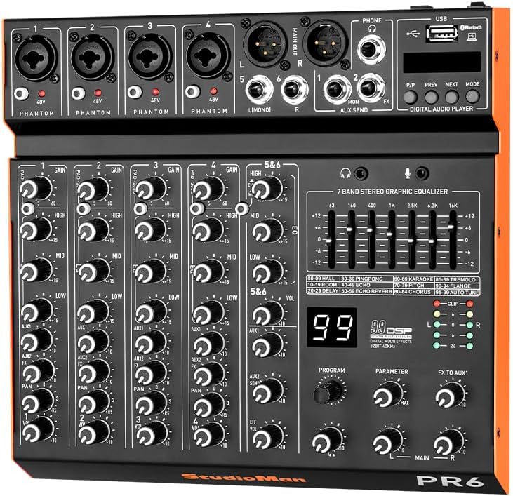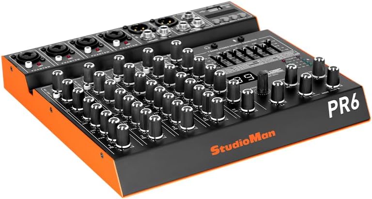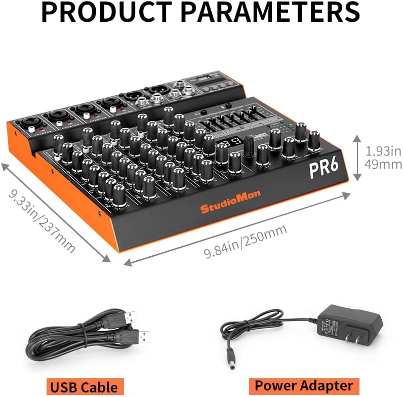 لوحة صوت لخلاط الصوت StudioMan PR6 ذات 6 قنوات مع 99 تأثير DSP، طاقة فانتوم 48 فولت، تحكم مستقل في PAN، اتصال الهاتف، 7 نطاقات EQ للبث المباشر، تسجيل الاستوديو، أداء DJ