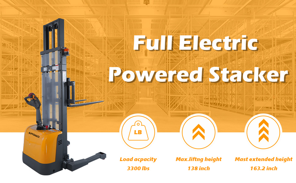 أبولوليفت مكدس كهربائي يعمل بالطاقة بالكامل مع أرجل ممتدة، سعة 3300 رطل، ارتفاع رفع 138 بوصة، شاحنة رفع مناولة المواد الكهربائية بالكامل، مع شوكات قابلة للتعديل