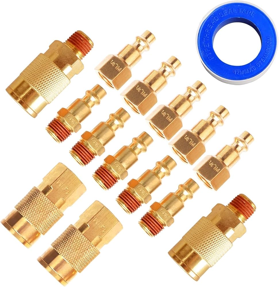 Fitting 15 pcs set Iron and copper plated material 2 pcs 1/4 inch female connector 2 pcs 1/4 inch male connector 5 male plug female threads 5 male plug male threads with sealant 1 raw meal belt.