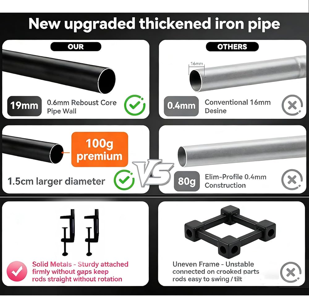 إطار معدني أسود متين مع مشابك آمنة: مصنوع من معدن أسود قوي لقوة وثبات يدومان، يتميز حامل قضيب الطاولة بمشابك شديدة التحمل يتم ربطها بقوة بالطاولات التي يصل سمكها إلى 3.5 بوصة. لا حاجة للحفر أو التثبيت الدائم - قم بإعداده في ثوانٍ!