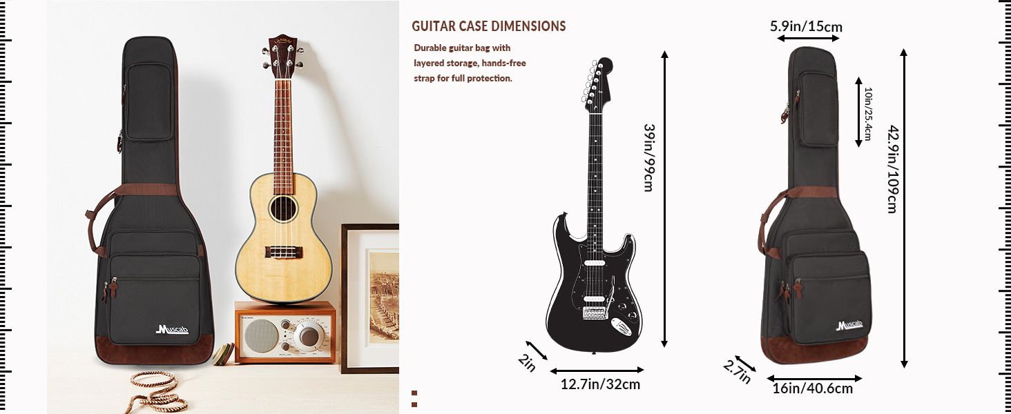 يناسب الجيتارات الكهربائية مقاس 39 بوصة. حقيبة ظهر للجيتار الكهربائي خفيفة الوزن تحتوي على حزام تثبيت للرقبة لإبقاء الجيتار في مكانه. غلاف مبطن سميك يوفر حماية جيدة للحفاظ على الآلة الموسيقية من الشقوق الخفيفة والكشوط والخدوش.