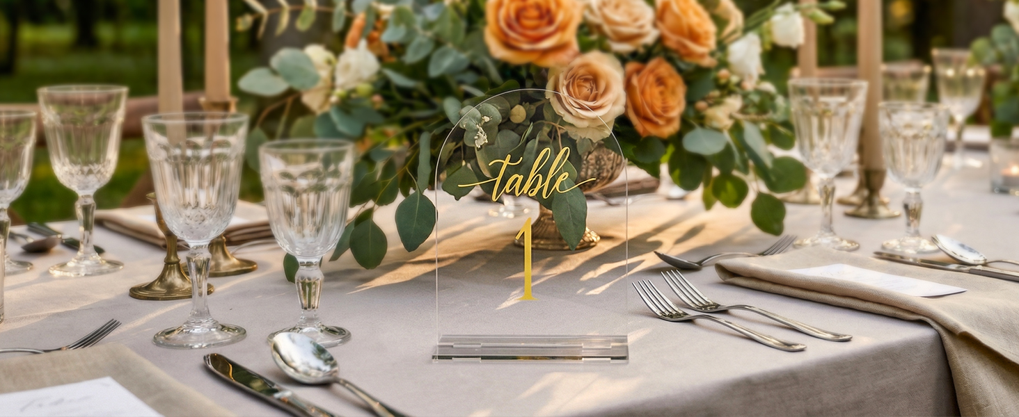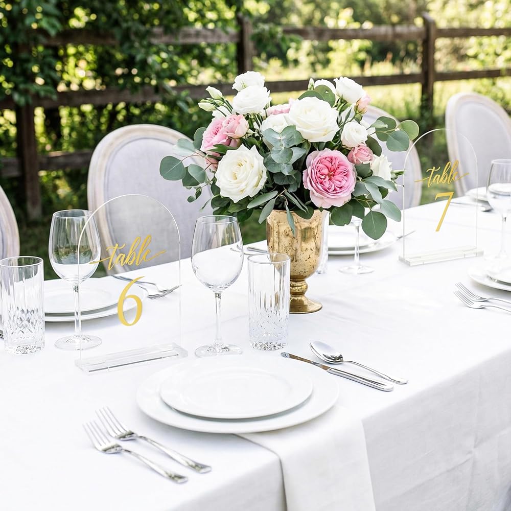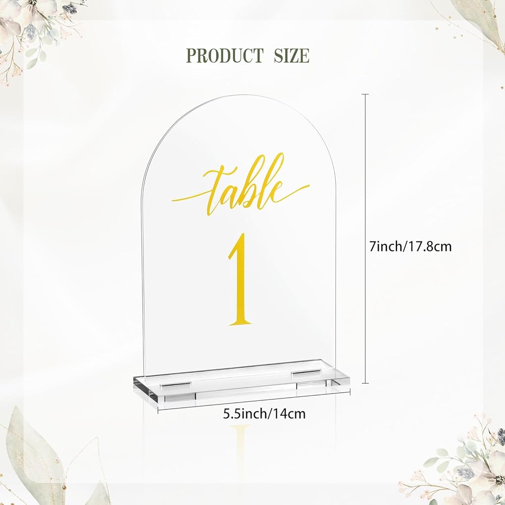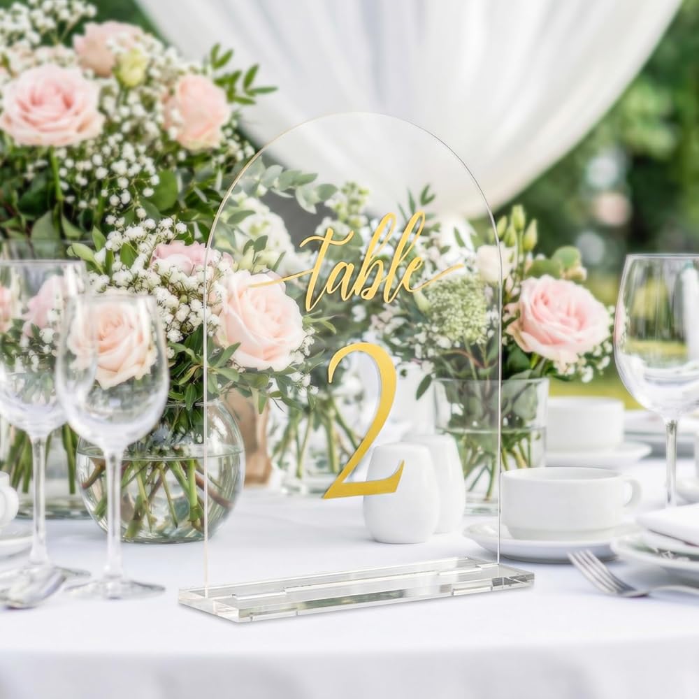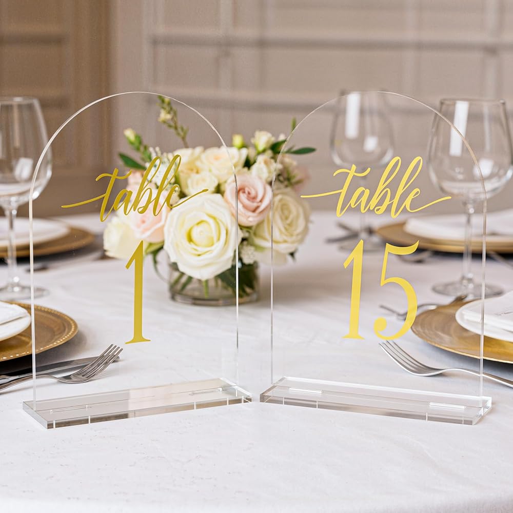 أرقام طاولات قوسية ذهبية أنيقة: أضف لمسة من الأناقة إلى حفل زفافك مع أرقام طاولات الأكريليك المقوسة هذه التي تتميز بأرقام ذهبية. يخلق تصميم الأكريليك الشفاف مع الحروف الذهبية مظهرًا عصريًا ومتطورًا لديكور طاولتك