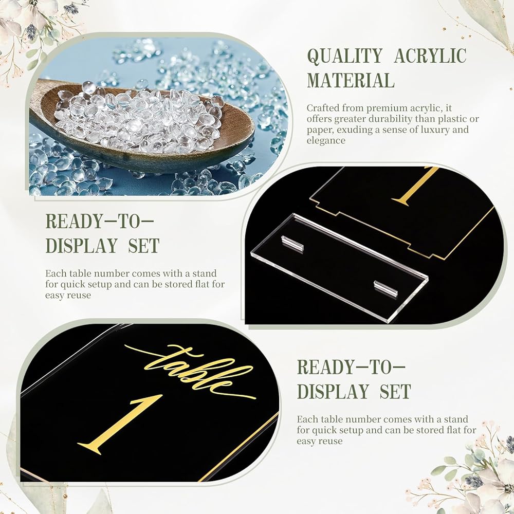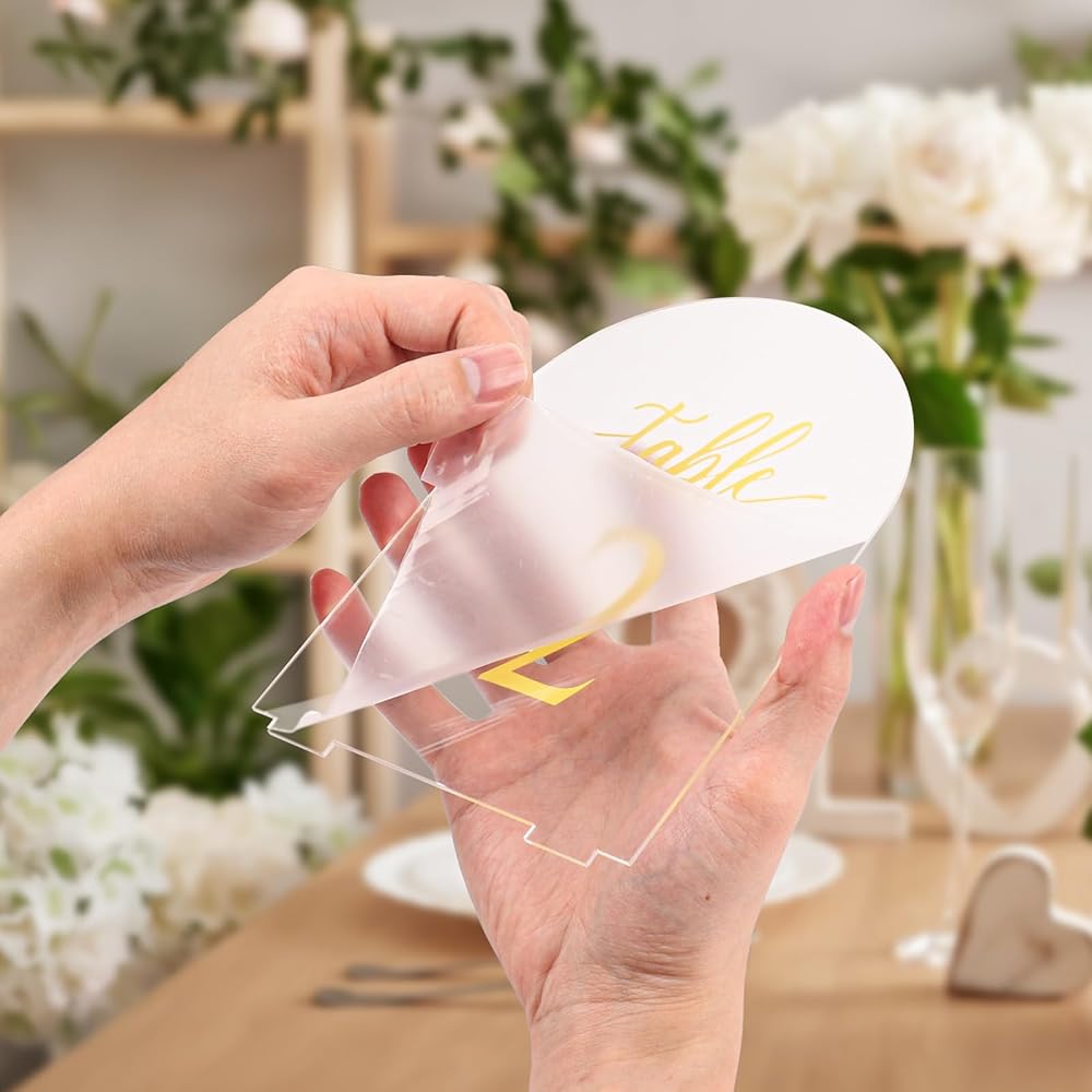 سهلة الإعداد: تنزلق كل علامة أكريليك ببساطة في حامل القاعدة المتضمن لعرض آمن. تأتي كل من الأرقام والقواعد مع طبقة واقية لمنع الخدوش أثناء الشحن، فقط قم بتقشيرها قبل الاستخدام