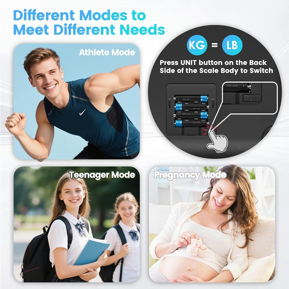 التبديل بين المستخدمين المتعددين: بعد إنشاء حساب في تطبيق Fitdays، يمكن إضافة 24 عضوًا. قبل القياس، يمكن لأعضاء التبديل تسجيل البيانات المادية الخاصة بهم. يمكن أيضًا تبديل الأوضاع المختلفة وفقًا للأعمار المختلفة، مثل وضع الأطفال ووضع الشباب وما إلى ذلك. يمكن للأشخاص الذين يمارسون الرياضة بانتظام استخدام وضع الرياضي بحيث تكون البيانات أكثر دقة. إنه مناسب جدًا للعائلات والمجموعات.