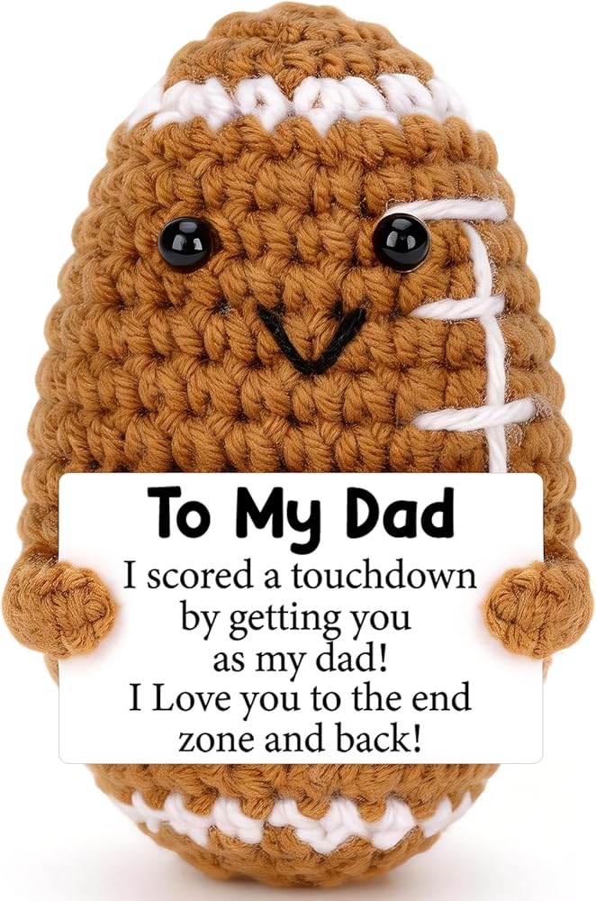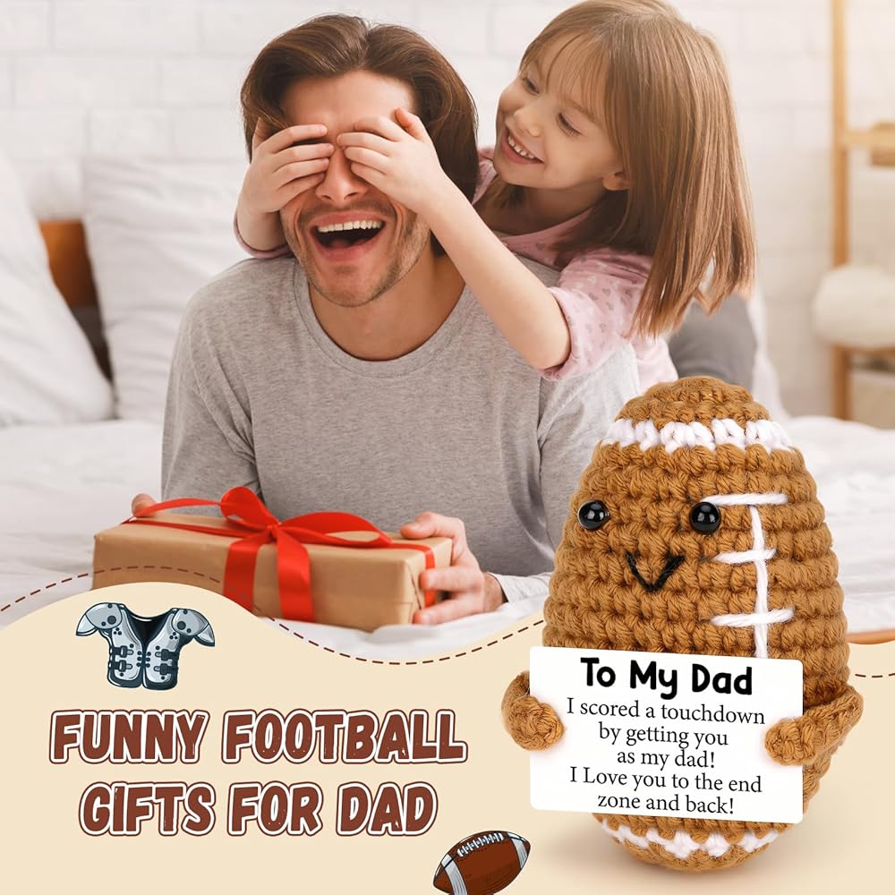 Mini Funny Football Valentines Gifts for Dad: This handmade crochet football comes with a message card that says, “I scored a touchdown by getting you as my dad. I Love you to the end zone and back”Blending humor with affection, it delivers a heartfelt expression of love and appreciation, making it a meaningful gift for your dad, step dad, father in law, bonus dad