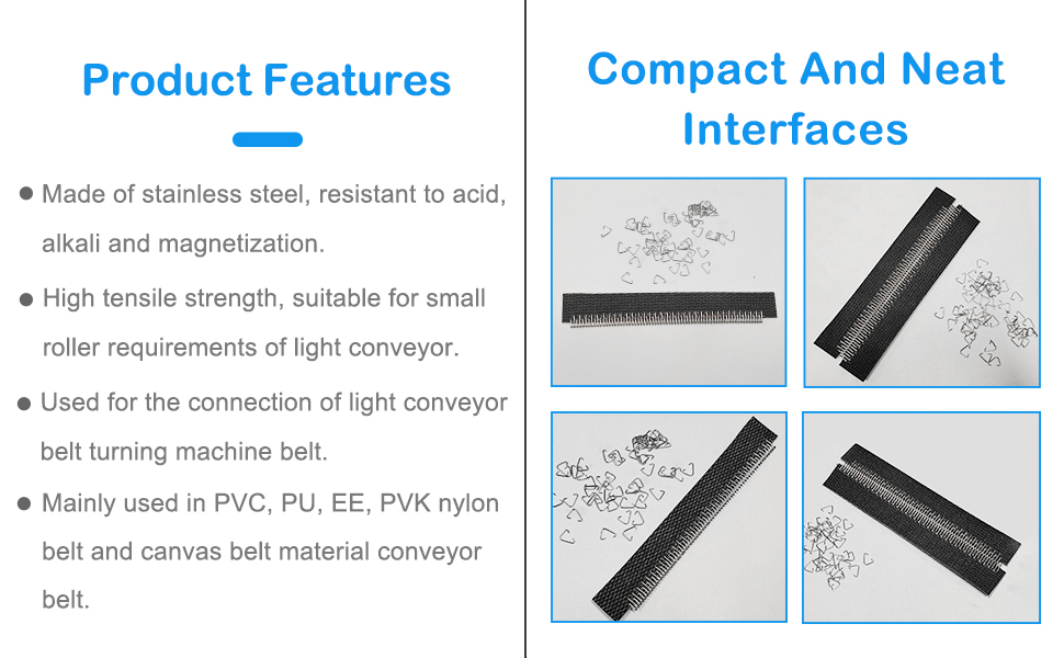 الاستخدام: هيكل الجسم بإبزيم قصير، يمكن أن يلبي متطلبات الناقل الخفيف للبكرات الصغيرة، ومناسب للـ PVC، PU، PE، PVK، النايلون، القماش، الحزام الناقل القرص الدوار اللوجستي، مفاصل الحزام الناقل لخط التجميع وما إلى ذلك.