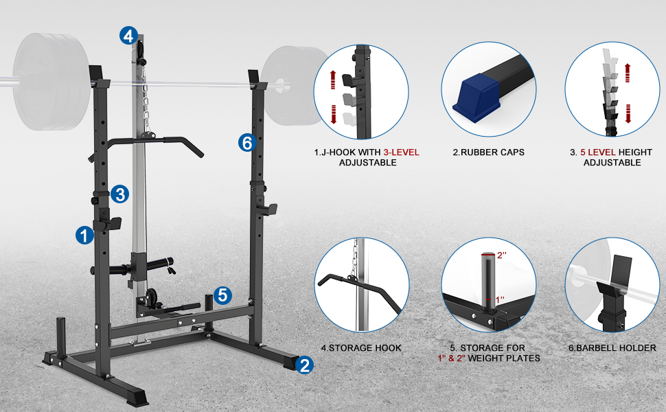 【صغير الحجم وقابل للتعديل】بالنسبة للإطار مع ارتفاع 5 مستويات (41-57 بوصة)، بالنسبة للخطاف J مع تعديل الارتفاع 3 مستويات، يمكنك بسهولة جعل المعدات تناسب طولك، وتلبي أغراض التمرين المختلفة.