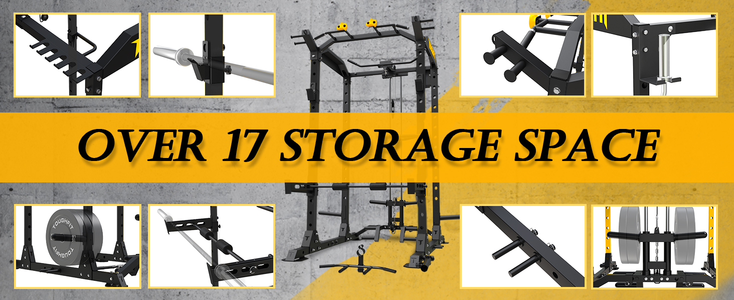 MORE ATTACHMENTS & STORAGES: Extra 18 Accessories for Free: Plate Carriage *4; Safety Bar *2; J Hook *2; Dip Bar *2; Lap Bar *1; T-BAR *1; Lat Bar *1; Quick Release Landmine *1; Quick Loading Pedal *2; Pull-up Handle *2. Provides more than 17 hooks for you to store various fitness accessories and handles like barbell, weight plates, resistance bands, etc .
