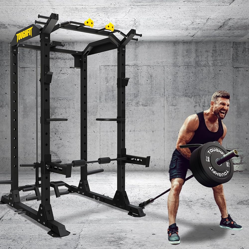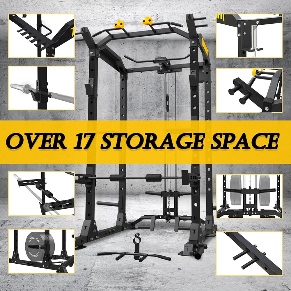 TOUGHFIT 2024 Upgraded T2 Power Cage Muti-Function Power Rack with Lat Pulldown System Squat Rack with Weights and Bar Set for Home Gym with Unique Training Attachment
