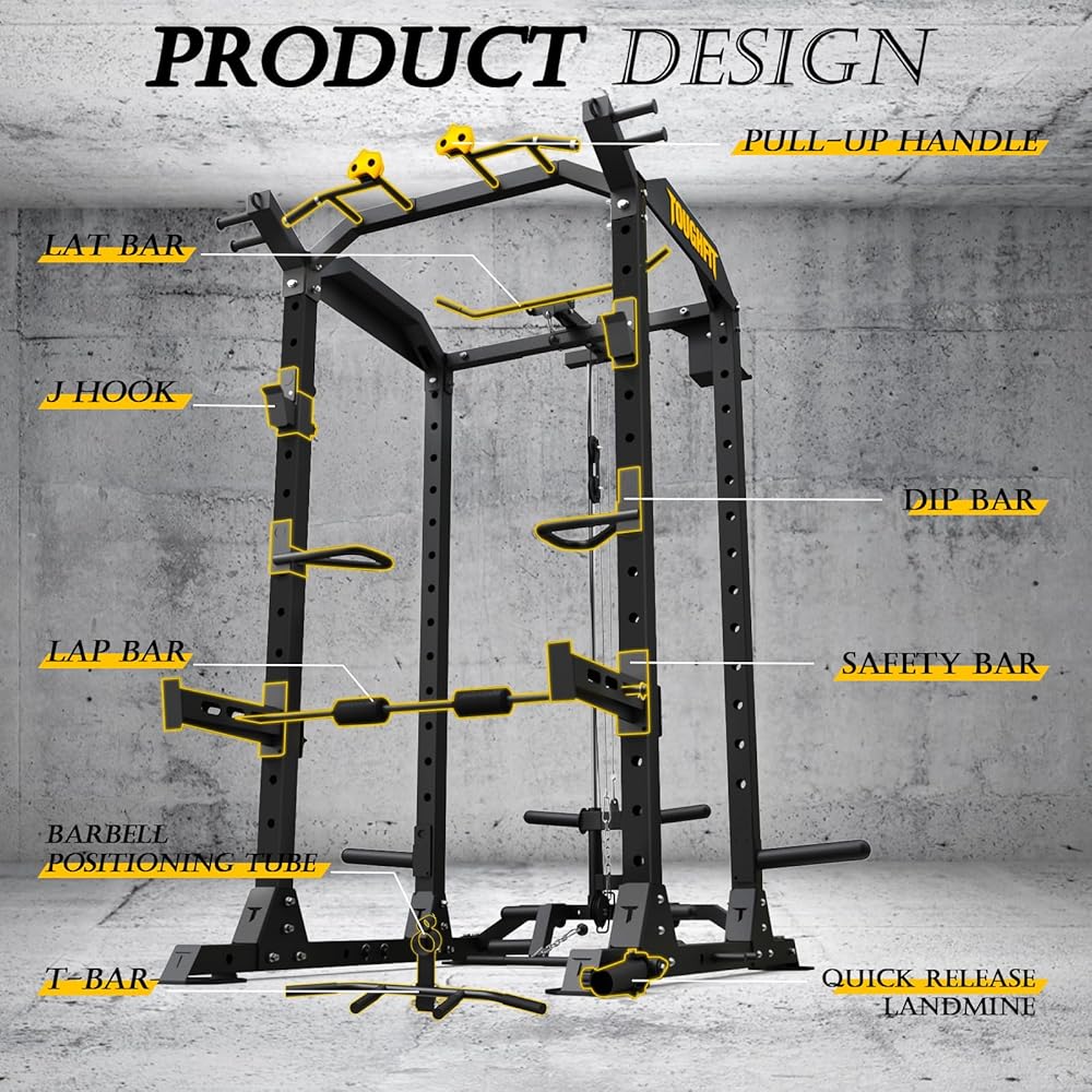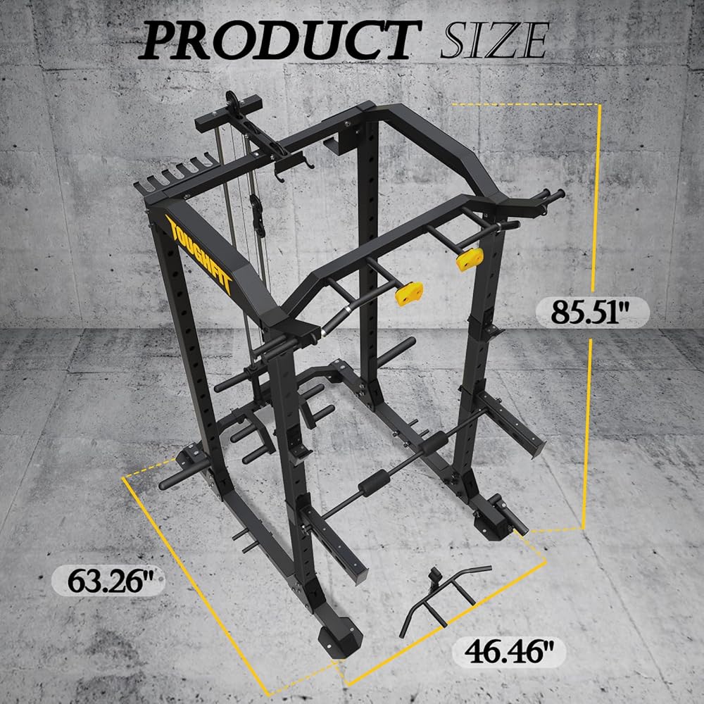 EXCELLENT LOAD-BEARING CAPACITY: The TOUGHFIT Power Cage has a maximum weight capacity of 1000 lbs and is ASTM-Certified. Our squat rack for home gym is constructed with durable 2*2'' steel tubes. The power rack dimensions are 46.46"L×63.26"W×85.51"H. Max capacity on attachments: Safety bar - 1100lbs; Plate carriage - 480lbs; Dip bar(single) - 395 lbs.