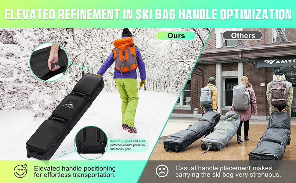إمكانية التنقل في المطار دون جهد، قم بالتمرير بسلاسة عبر المحطات ومحطات النقل المكوكية ومواقف السيارات بعجلات متينة وحشوة معززة. لا مزيد من سحب المعدات الثقيلة - حقيبة السفر المخصصة للتزلج على الجليد والمزودة بعجلات تحول الرحلات الطويلة إلى رحلات سهلة.