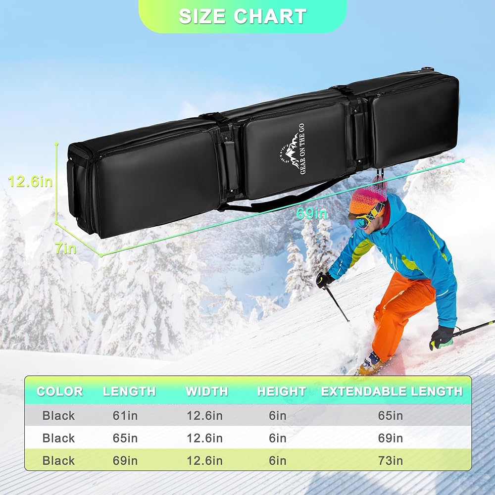 مقاس قابل للتعديل 69-73 بوصة تصميم قابل للتوسيع 4 بوصات يناسب الزلاجات أو ألواح التزلج حتى 71 بوصة، مما يجعلها حقيبة التزلج المبطنة المثالية للزلاجات الطويلة والتعبئة متعددة المعدات. مثالية للمسافرين الجادين الذين يبحثون عن حقيبة تزلج معتمدة من شركة الطيران ومصممة للسفر عالي الأداء.