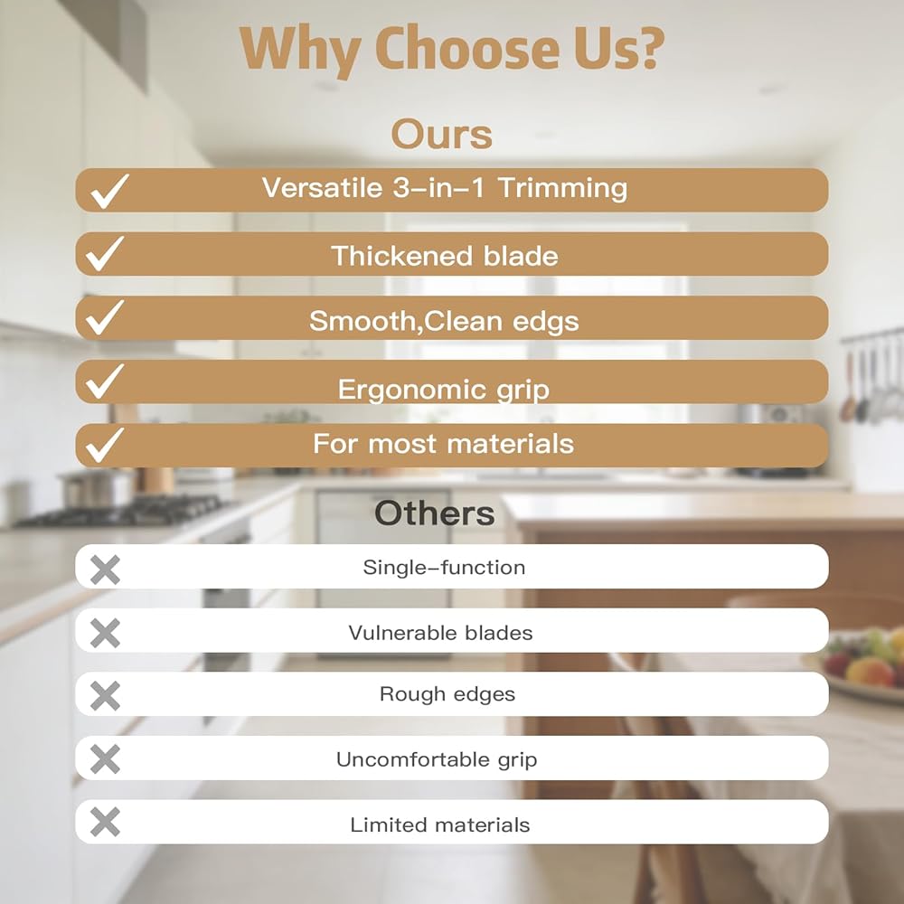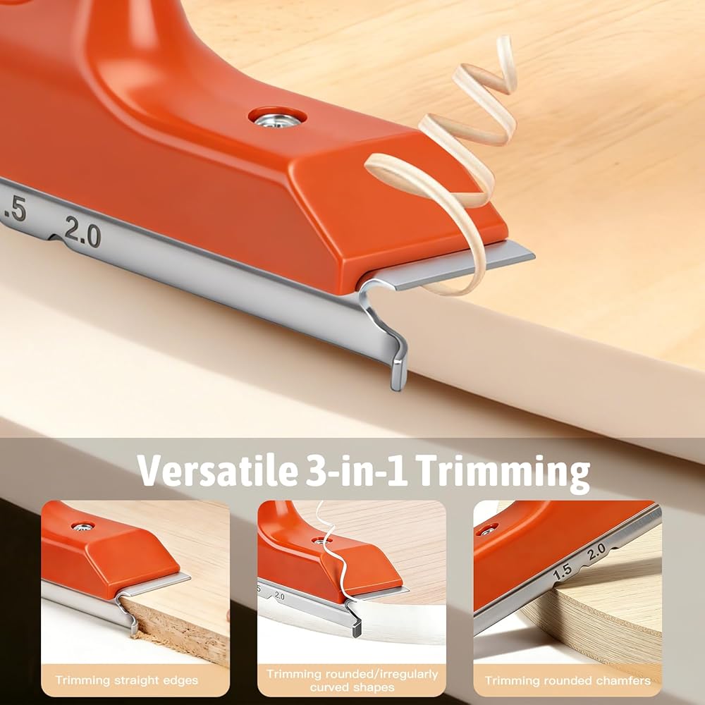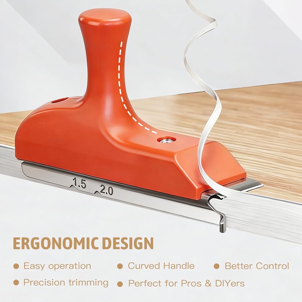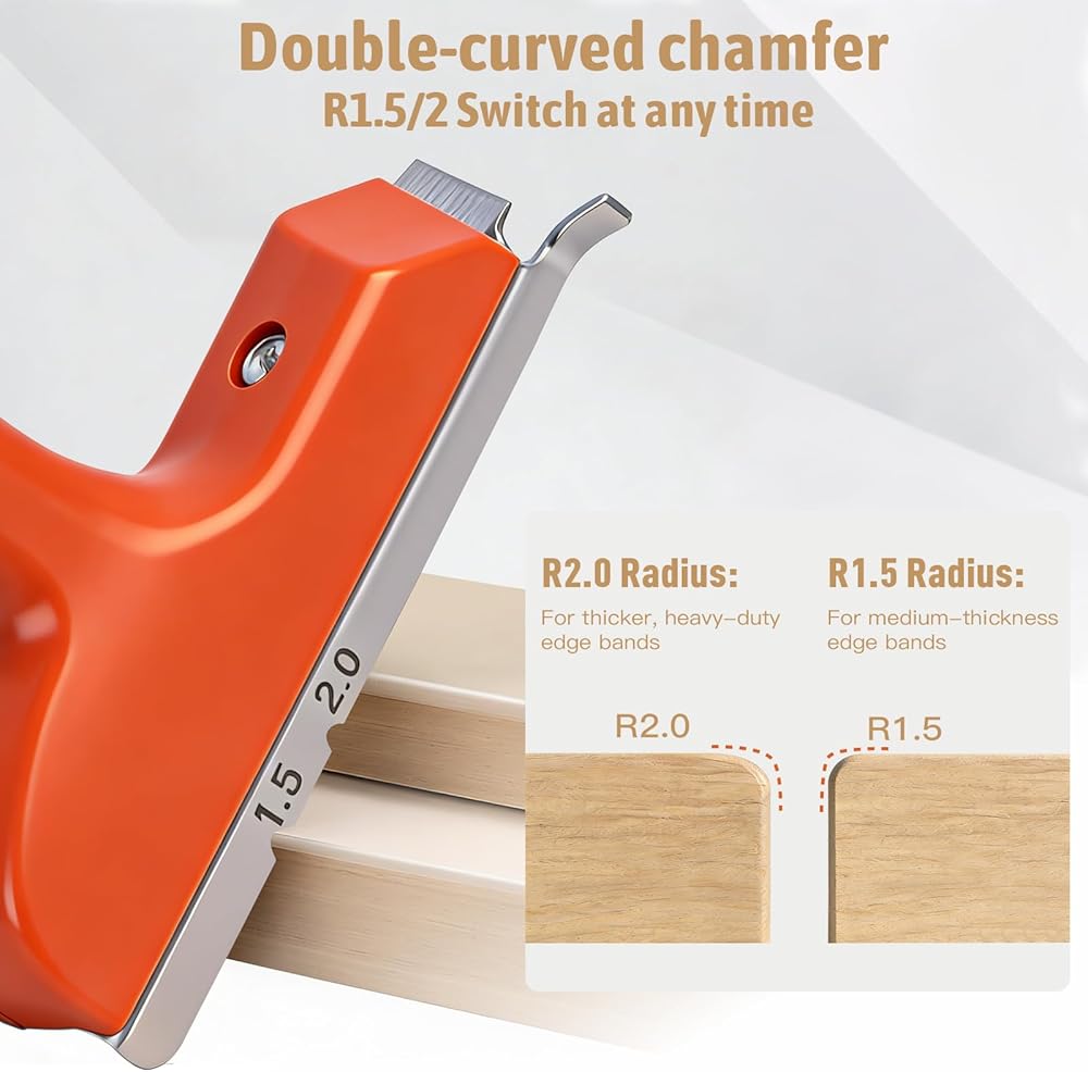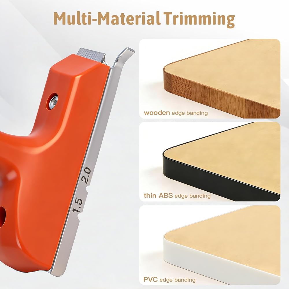 【توافق المواد والاستخدام الآمن】 مُحسّن لألواح MDF، وألواح الجسيمات، والخشب الرقائقي، والميلامين مع أشرطة PVC أو ABS أو القشرة. إرشادات الاستخدام: لضمان الدقة، هذه الأداة مخصصة للمنحنيات المستقيمة والخارجية (المحدبة) فقط. لا يُنصح باستخدامه للمنحنيات الداخلية الضيقة (المقعرة) أو ABS السميك من الدرجة الصناعية. تجنب الاستخدام على الخشب الصلب الذي يزيد سمكه عن 2 مم لمنع تلف الشفرة.